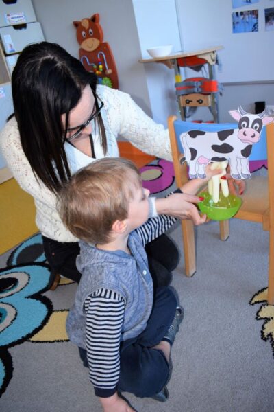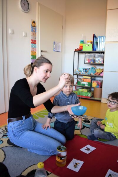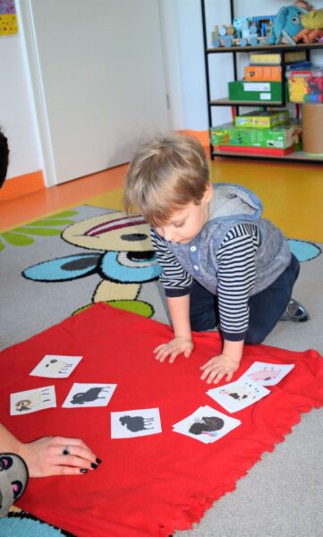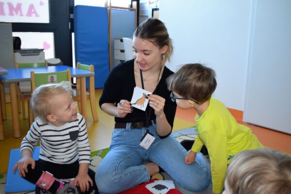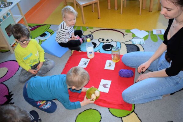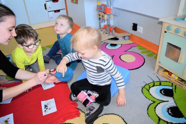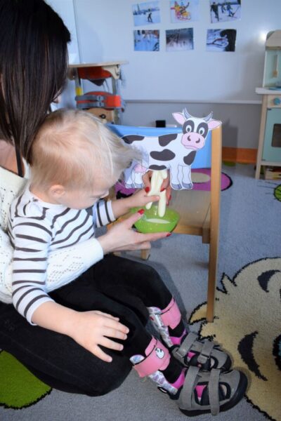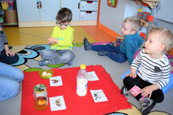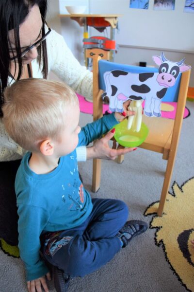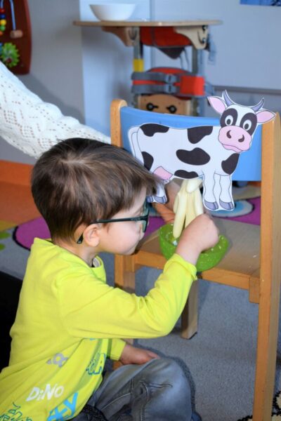 Dziś grupa maluszków poznawała zwierzęta mieszkające na wsi. Niektóre z nich były już dzieciom bardzo dobrze znane, inne trochę mniej. Dowiedzieliśmy się gdzie mieszkają, co lubią jeść oraz co nam dają. Dowiedzieliśmy się skąd się bierze mleko, jajko, miód i wełna. Dzieci dopasowywały poszczególne produkty do zwierzątek, od których one pochodzą.  Słuchaliśmy  też dźwiękowych zagadek. Dzieci słuchały odgłosów jakie wydają zwierzęta i odgadywały które to na obrazku. Na koniec małe rączki miały trudne zadanie do wykonania. Trzeba było wydoić mała krówkę. Chociaż zadanie wcale nie było łatwe, dzieci jak zwykle spisały się znakomicie.