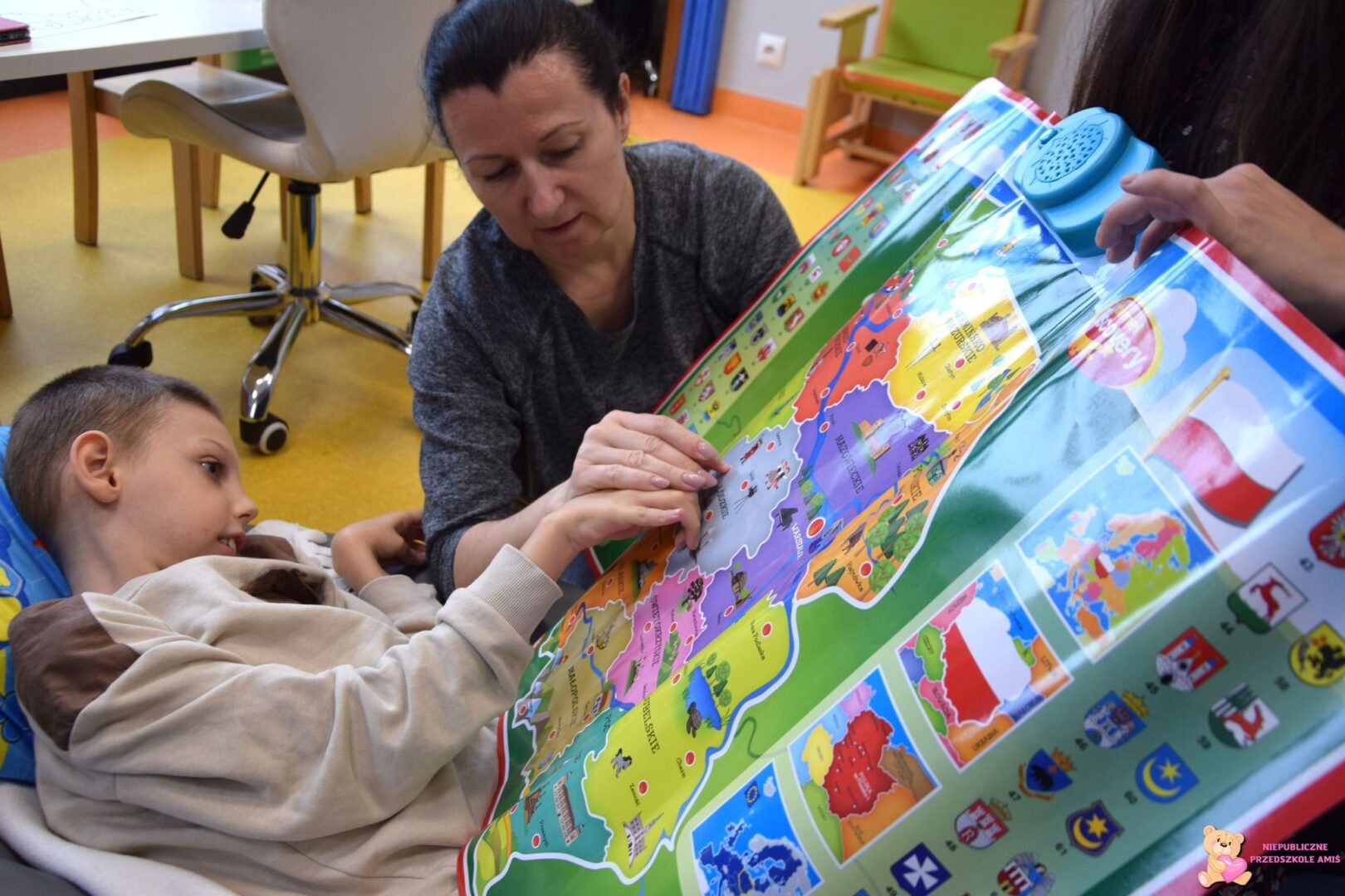 Dużo radości sprawiło dzieciom oglądanie interaktywnej mapy Polski, na której wyszukiwały miejscowości, które dobrze znają, w których mieszkają oraz te, do których jeżdżą na wakacje.