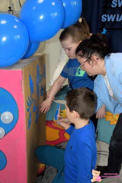 na znak solidaryzowania się z osobami dotkniętymi tym zaburzeniem. Celem zajęć było zwiększenie świadomości i wrażliwości w temacie autyzmu. Dzieci wspólnie wykonywały zadania na wielkim pudle, a każda strona pudełka przeznaczona była do innej czynności. Pierwsze zadanie polegało na dopasowywaniu charakterystycznych zachowań osób z spektrum Autyzmu. Kolejnymi zadaniami dzieci było ozdabianie, niebieskiego motyla