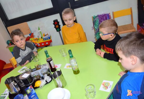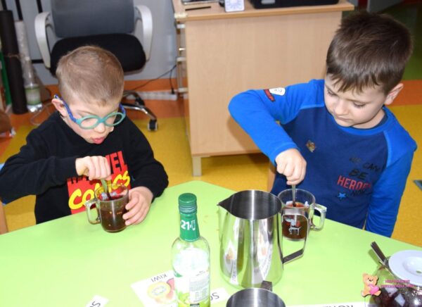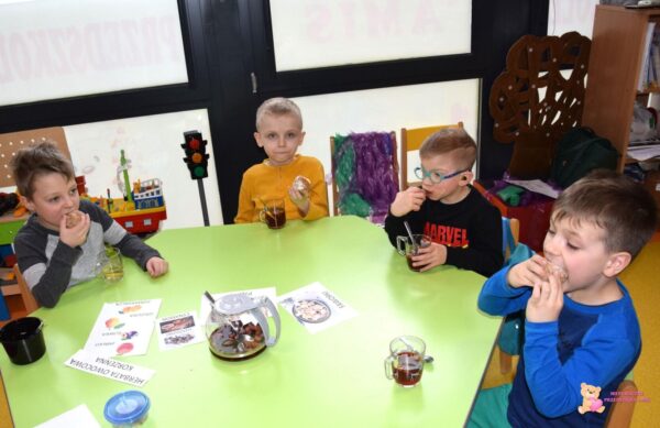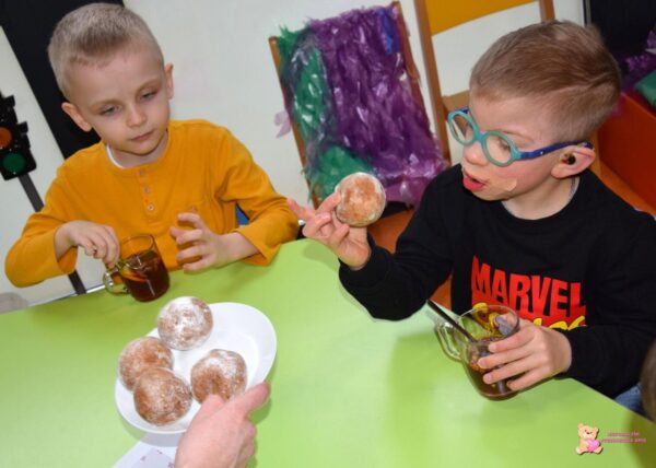 W minionym tygodniu grupa Jeżyków omawiała tematy związane z karnawałem. Dzieci wykonały maski karnawałowe, poznały zwyczaje związane z tym okresem oraz uczestniczyły w zabawach ruchowych. Wprowadzono literkę „B” oraz cyfrę „0”. Chłopcy utrwalali znajomość liter i cyfr. Rozwijano także umiejętności dodawania na konkrecie. Zwięczeniem tygodnia było rozwijanie zmysłu smaku- chłopcy mieli okazję spróbować różnych typów herbatek oraz podtrzymali karnawałową tradycję poprzez zjedzenie smakowitych pączków. ![]()