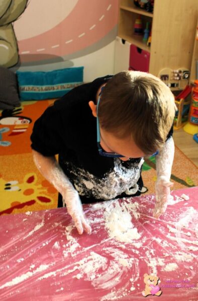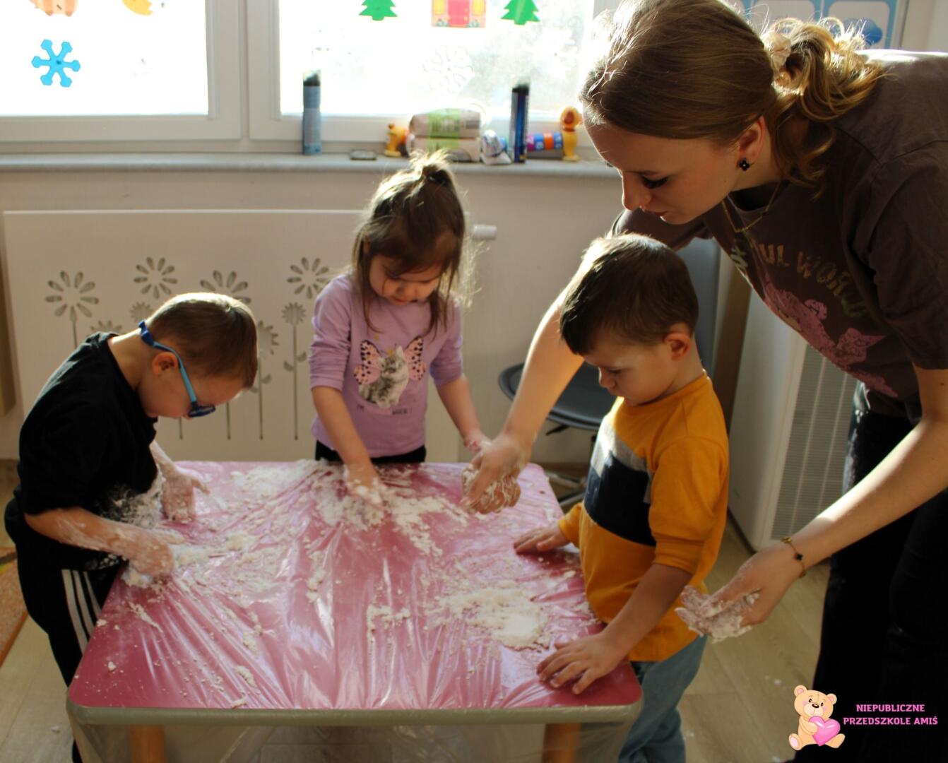. Ćwiczyły w ten sposób motorykę małą. Na sensoplastyce dzieci łączyły skrobię ziemniaczaną z pianką do golenia, tworząc sztuczny śnieg![]()