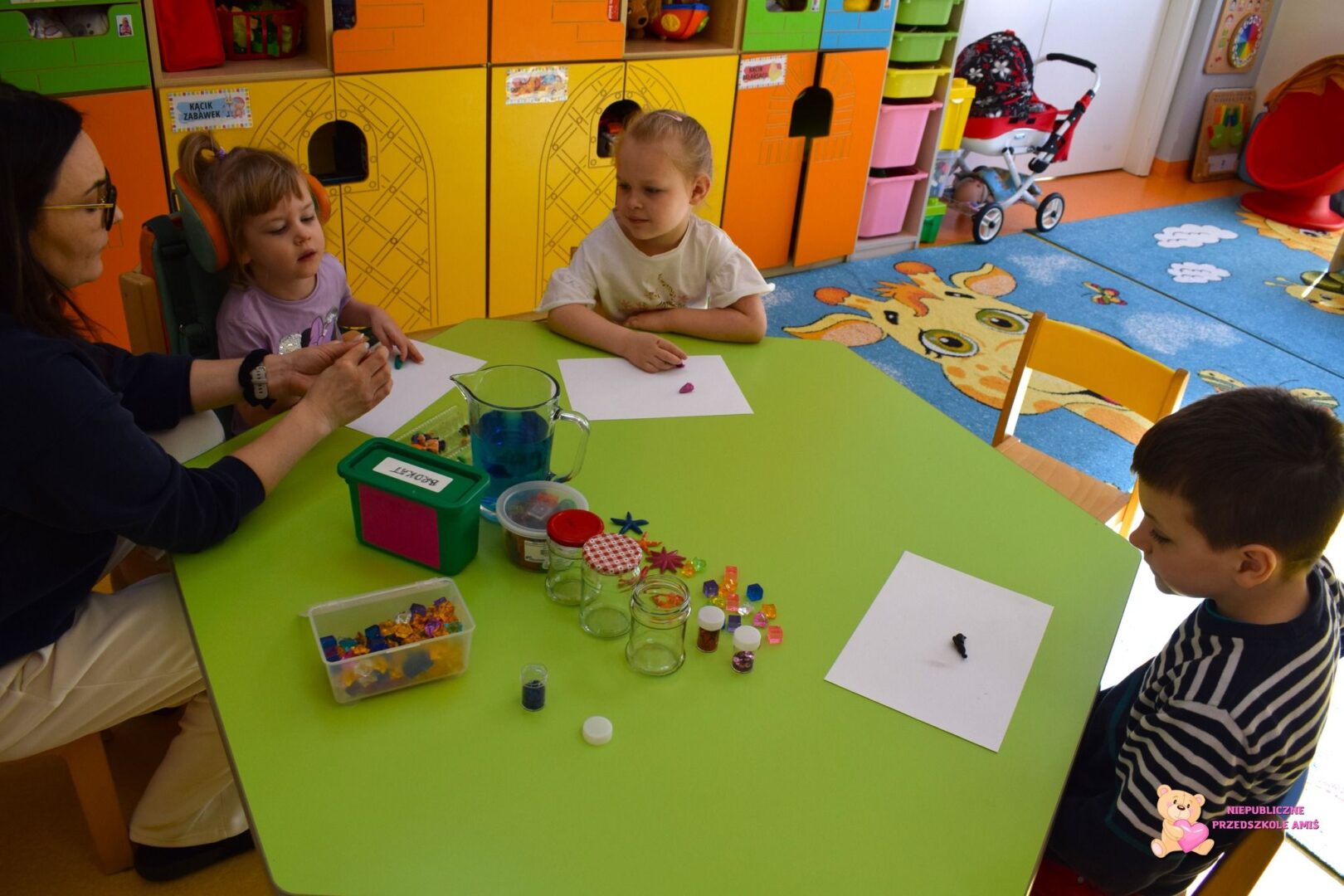 W ostatnich dniach nasze Gwiazdeczki przeżyły prawdziwą podróż w czasie i pełne wrażeń zajęcia sensoryczno-poznawcze! Dzieci z ogromnym zaangażowaniem tworzyły własne „akwaria” w słoikach. Przelewały wodę, wsypywały kolorowe elementy, dodawały morskie ozdoby i obserwowały, jak wszystko unosi się i miesza. Było dużo radości, ćwiczeń małej motoryki i stymulacji zmysłów – dotyku, wzroku oraz koordynacji wzrokowo–ruchowej. Podczas zabaw dydaktycznych utrwalaliśmy przeliczanie w zakresie 7. Gwiazdeczki poznały fascynujący świat prehistorii. Dowiedziały się, jak wyglądały mamuty oraz tygrysy szablozębne, czym się charakteryzowały i w jakich czasach żyły. Dzieci z zaciekawieniem oglądały ilustracje i dzieliły się swoimi spostrzeżeniami.