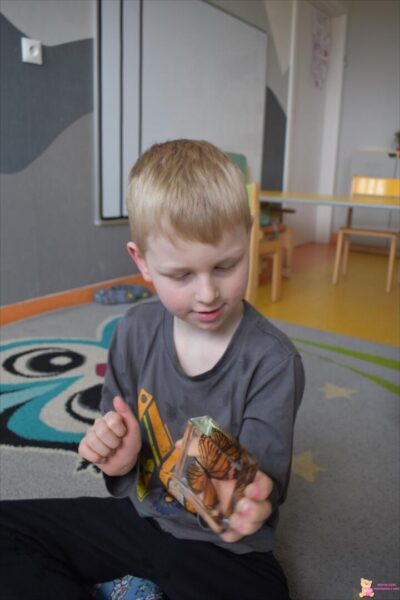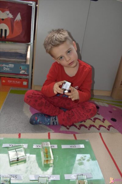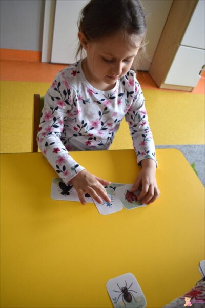 . Rozwijały słuch poprzez wskazywanie na planszy usłyszanych owadów. Na tablicy multimedialnej dopasowywały nazwy do obrazka. Poznały sposoby użycia przedmiotów służących do dokonywania mierzenia różnych przedmiotów.