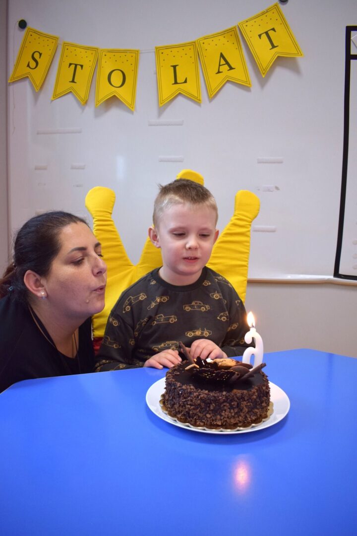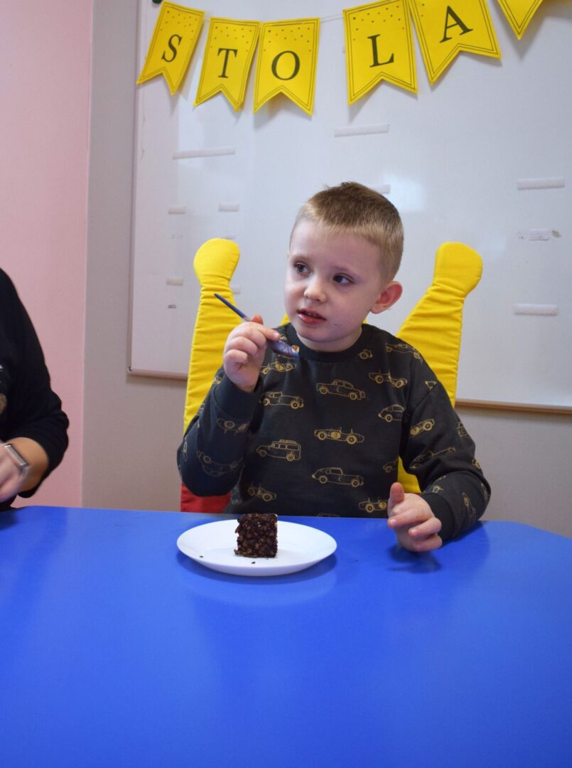 Wszyscy odśpiewaliśmy jubilatowi gromkie 100 lat a Veronica wręczyła mu urodzinową kartkę z najlepszymi życzeniami od dzieci i cioć z grupy. Po życzeniach wszyscy skosztowaliśmy tortu, który przyniosła do przedszkola mama Wojtusia. Dziękujemy bardzo i jeszcze raz życzymy naszemu jubilatowi dużo zdrówka i uśmiechu.