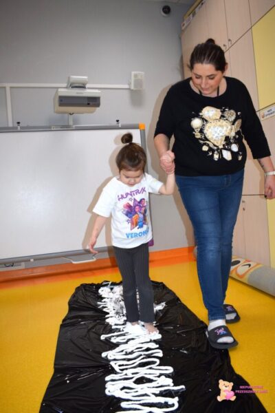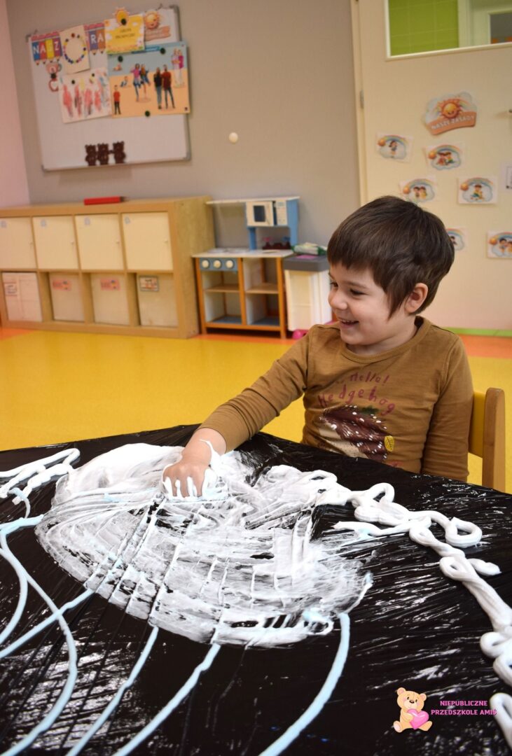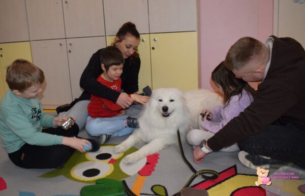 W tym tygodniu jak co tydzień przedszkolaki z grupy Promyczków uczestniczyły w zajęciach z dogoterapii, podczas których wykonywały czynności związane z pielęgnacją psa takie jak czesanie oraz karmienie. Oprócz tego realizowaliśmy zajęcia dydaktyczne podczas, których przedszkolaki rozwijały umiejętności matematyczne polegające na przeliczaniu na konkretach. Rozmawialiśmy również o tym jakie zmiany zachodzą w naszym wyglądzie na przestrzeni lat. Oglądaliśmy zdjęcia z okresu niemowlęcego naszych Amisiaków. Promyczki uczestniczyły w zabawie sensorycznej, w której z pomocą cioci ślizgały się po „sztucznym śniegu”. Aktywność ta stymulowała zmysł dotyku oraz przyniosła dzieciom wiele radości.