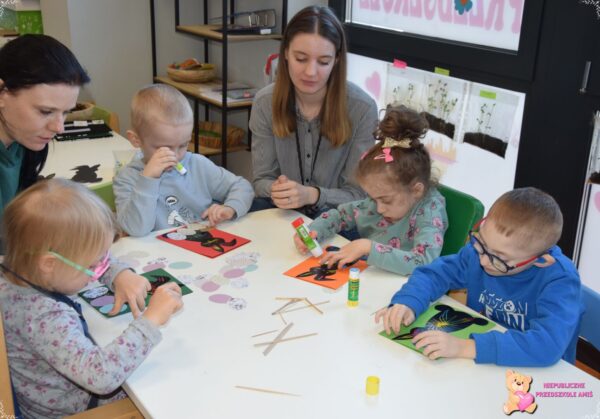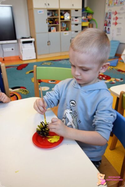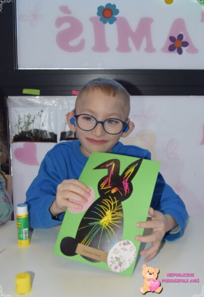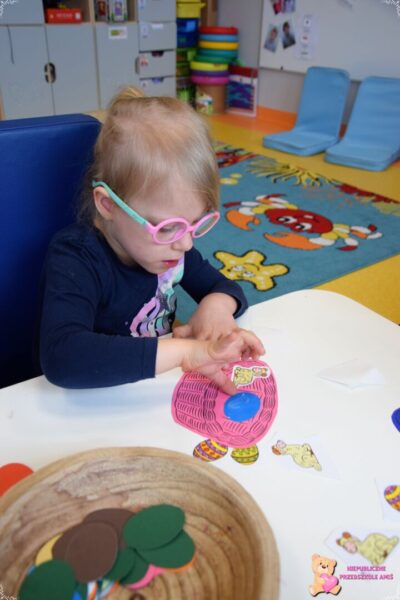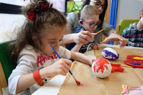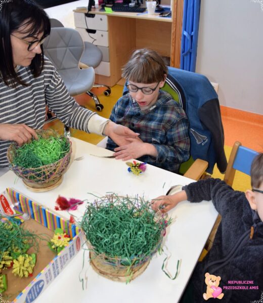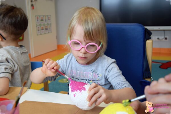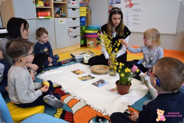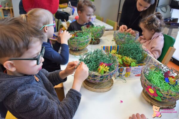 Już w ubiegłym tygodniu w grupie Gwiazdeczki rozpoczęliśmy przygotowania do Świąt Wielkanocnych, wykonując kartki świąteczne i palmy wielkanocne, które dzieci zabrały do domu. W tym tygodniu dzieci poznały symbole świąt i tradycje świąteczne. Dowiedziały się, co powinno znaleźć się w koszyczku wielkanocnym i wyklejały taki koszyczek z gotowych elementów. Na zajęciach plastycznych nasze Gwiazdeczki tworzyły kurczaczki z szyszek, które malowały farbami, a potem zdobiły piórkami. Malowały również farbami jajka styropianowe i gipsowe oraz wyklejały kartonowe jajka. Wszystkie te ozdoby znalazły się w ich stroikach świątecznych. Oglądaliśmy jajka ptaków, które są równie piękne i kolorowe, jak te malowane przez nas. Klasyfikowaliśmy jajka według koloru i wzoru. Ten tydzień był bardzo intensywny oraz pracowity i wprowadził nas w świąteczny nastrój.
