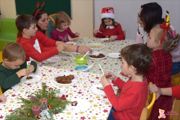 W ramach zajęć „Kuchcikowo” dzieci ozdabiały pierniczki , które w ubiegłych tygodniach razem piekliśmy. Dzieci dekorowały pierniczki według własnego pomysłu, używały do tego kolorowych pisaków i posypek w kształcie kuleczek, śnieżynek i choinek. Ozdabianiu pierniczków towarzyszyła świąteczna muzyka w tle. Następnie Amisiaki odwiedził Święty Mikołaj