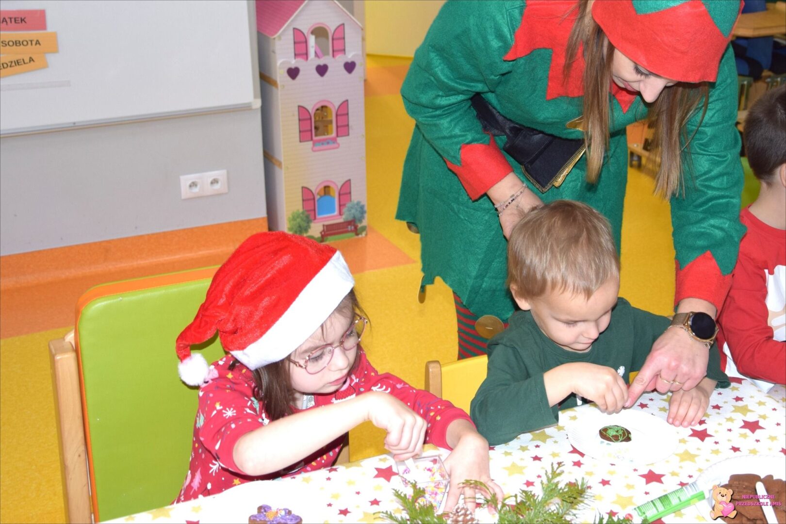 W ramach zajęć „Kuchcikowo” dzieci ozdabiały pierniczki , które w ubiegłych tygodniach razem piekliśmy. Dzieci dekorowały pierniczki według własnego pomysłu, używały do tego kolorowych pisaków i posypek w kształcie kuleczek, śnieżynek i choinek. Ozdabianiu pierniczków towarzyszyła świąteczna muzyka w tle. Następnie Amisiaki odwiedził Święty Mikołaj