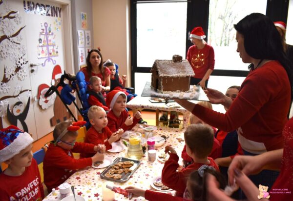 . Wszystkie dzieci wraz z ciociami ochoczo zabrały się do tej przyjemnej pracy. Kreatywność naszych dzieci jak zwykle nas nie zawiodła. Było pysznie i kolorowo. Zapach piernika unosił się po całym przedszkolu. Nie zabrakło też najbardziej wyczekiwanego gościa – Świętego Mikołaja
