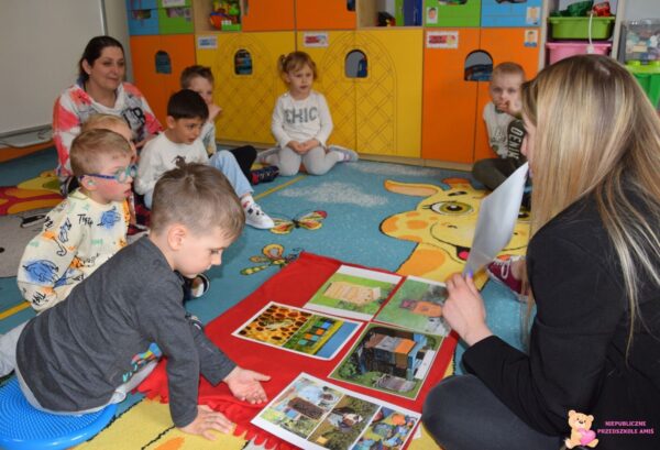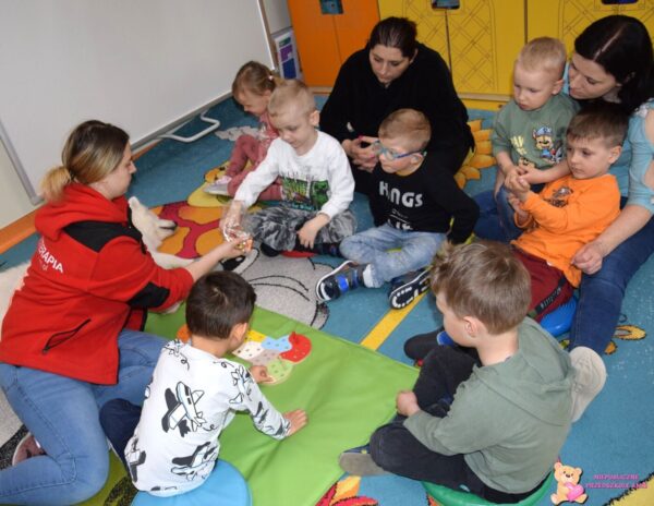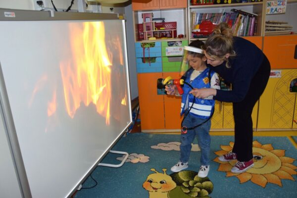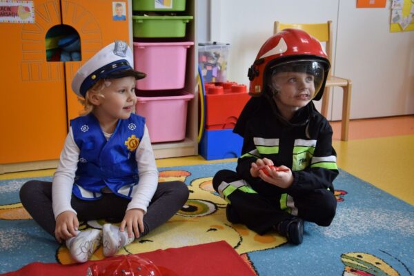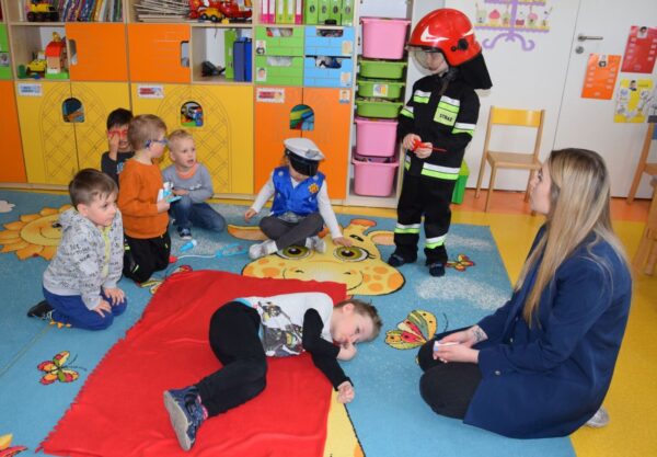 Dzieci omawiały tematy związane z bezpieczeństwem. Poznały numery alarmowe, ćwiczyły rozmowę telefoniczną z operatorem numeru ratunkowego. Miały okazje obejrzeć atrybuty lekarza, strażaka i policjanta oraz wcielić się w wybraną postać. Ćwiczyliśmy także ułożenie poszkodowanego w pozycji bezpiecznej.