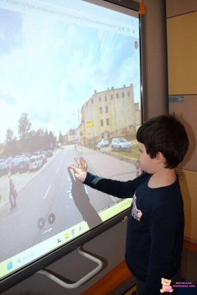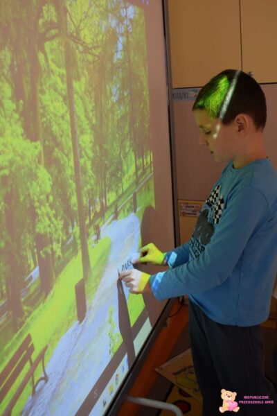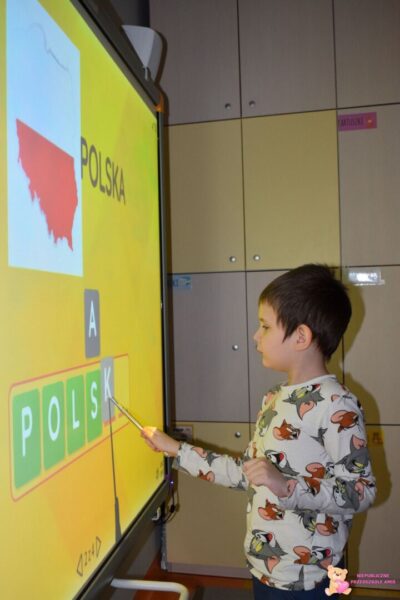 oraz rozwijania umiejętności manualnych. Kolejnym zadaniem było wyklejanie konturów litery „M” z kolorowych kulek z bibuły w barwach narodowych. Podsumowując wiadomości chłopcy wykonywali zadania na tablicy multimedialnej.