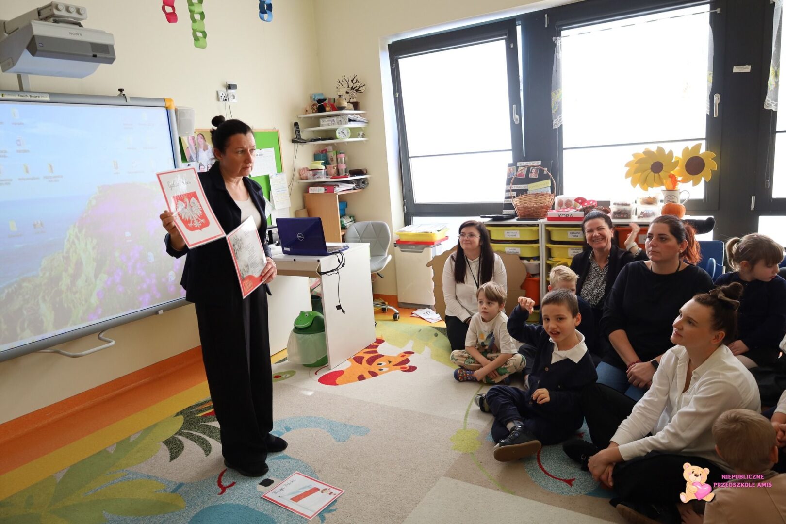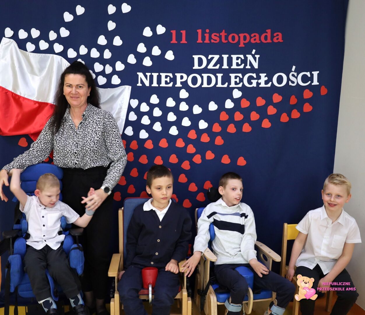W dniu wczorajszym obchodziliśmy uroczystość Narodowego Święta Niepodległości . Amisiaki poznały polskie symbole narodowe i odśpiewały Hymn Polski. Obejrzały również prezentację dotyczącą historii naszego państwa oraz wspólnie wykonały pracę plastyczną.