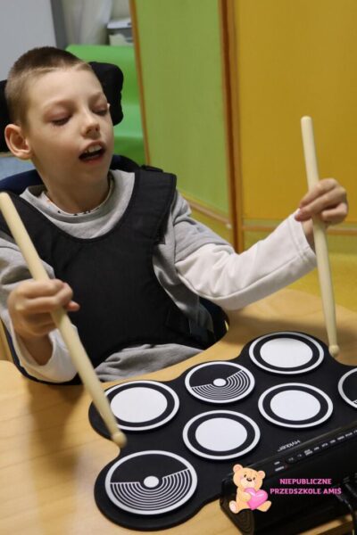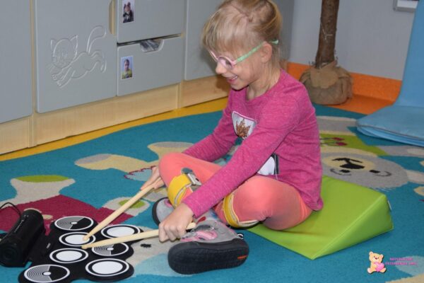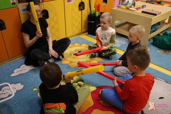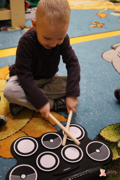 Na muzykoterapii dzieci poznały nowy instrument perkusję elektroniczną. Podejmowały próby grania na niej, słuchały różnych dźwięków elektronicznych. Następnie przeszliśmy do zabaw z bum rurkami w piratów na morzu oraz wykonaliśmy znany nam już nam utwór muzyczny Klaxons.