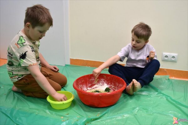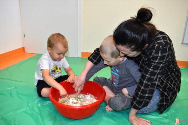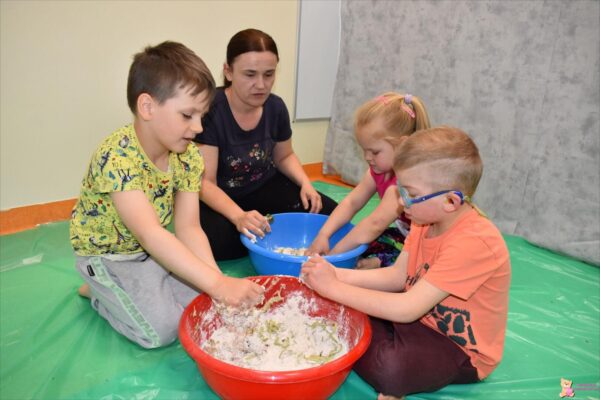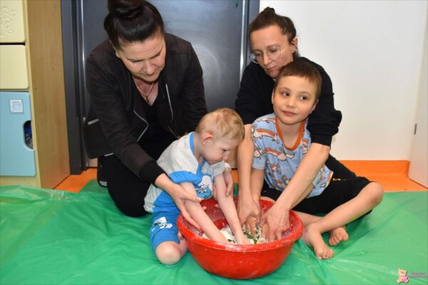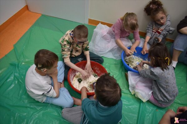 Na zajęciach z Sensoplastyki pojawił się pewien zielony składnik. Nie od razu wiedzieliśmy co to jest. Na początku obserwowaliśmy go, dotykaliśmy, poznawaliśmy jego strukturę, smakowaliśmy. Jednym słowem poznaliśmy go polisensorycznie. Jesteście ciekawi co to było? To był szpinak! Oczywiście nie bylibyśmy sobą gdyby tylko na poznaniu szpinaku się skończyło. Ciocia dała nam kolejne produkty, które mogliśmy dodać do wspólnego mieszania, a były to: suchy makaron szpinakowy, herbatka malinowa, olej oraz woda. Otrzymaną masę mogliśmy wałkować, lepić, wycinać.