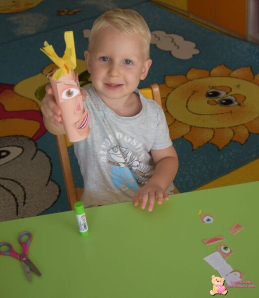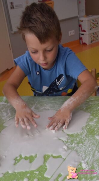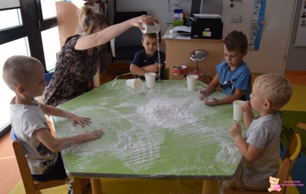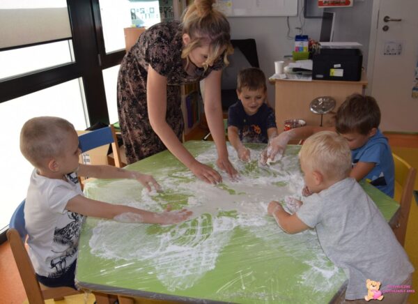 Przypomnieli sobie także, co znajduje się w poszczególnych kącikach zainteresowań w sali przedszkolnej. Podczas zajęć dydaktycznych poznali bohaterów, którzy będą prowadzić ich podczas ćwiczeń z kartami pracy. Wykonali pracę plastyczno – techniczną „Portret”, gdzie ćwiczyli ruchy precyzyjne i doskonalili umiejętność wycinania nożyczkami. Zwięczeniem tygodnia była zabawa cieczą nienewtonowską, która przysporzyła chłopcom wiele frajdy.