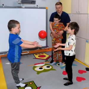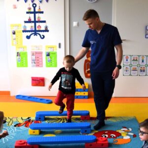 . Przygotował dla przedszkolaków tor przeszkód, ćwiczenia koordynacji ruchowej z koordynacja wzrokową – reakcja na światło, ćwiczenia na piłce i rzucanie do celu