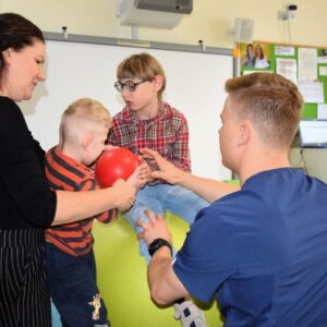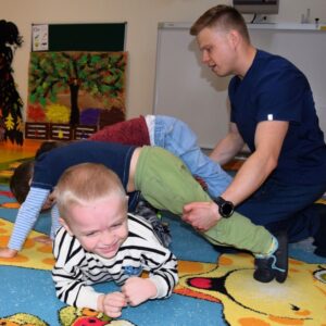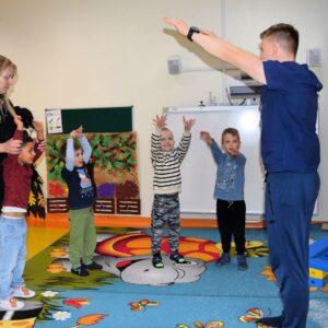 W naszym przedszkolu realizujemy cykl spotkań z ciekawymi osobami, tym samym realizując kierunki polityki oświatowej na rok szkolny 2023/2024. Dziś obyło się spotkanie z Fizjoterapeutą, a zarazem Terapeutą Integracji Sensorycznej. Pan Mateusz najpierw opowiedział nam o swojej pracy. Poprzez swoje odpowiednie podejście zachęcił dzieci do wspólnych ćwiczeń