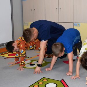. Dzieci bardzo się starały wykonywać prawidłowo wszystkie ćwiczenia oraz świetnie się przy tym bawiły. Pan Mateusz dostosował zadania, ich poziom trudności i przebieg do możliwości psychoruchowych dzieci.