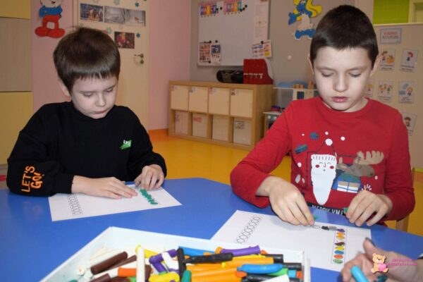 czy różnorodne święta i wydarzenia. Doskonalili także swoje umiejętności pisania cyfry „7” oraz litery „L”, wykorzystując materiały plastyczne do wyklejania ich kształtów oraz ćwicząc pisanie po śladzie.