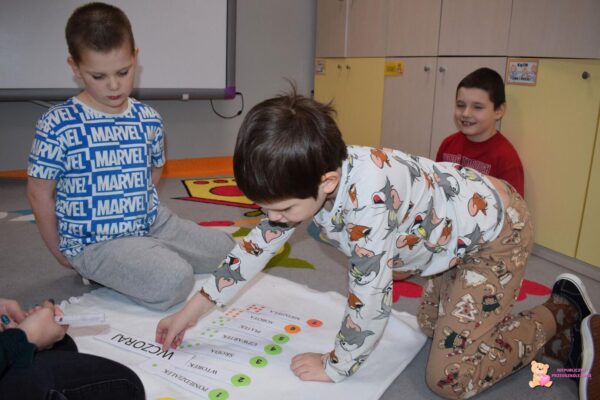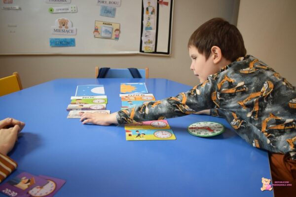 . Dzieci przypomniały sobie nazwy miesięcy, dni tygodnia oraz pór roku. Ćwiczyli również ustawianie godziny na zegarze i dopasowywanie różnych czynności do pory dnia