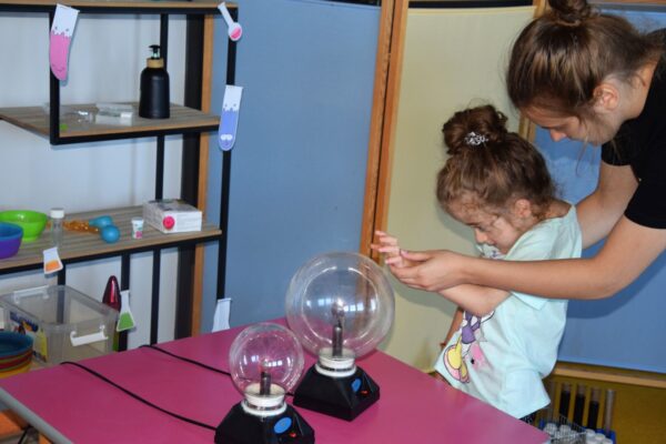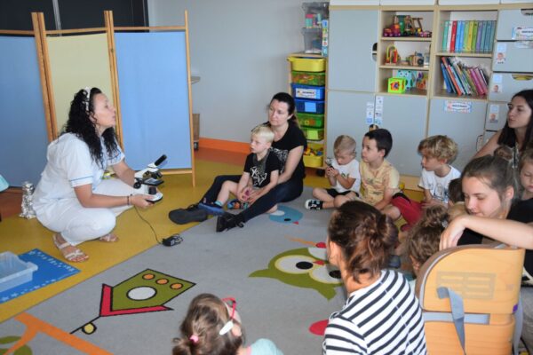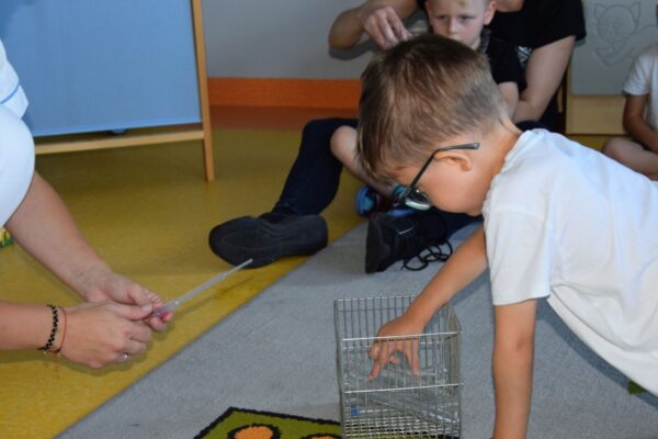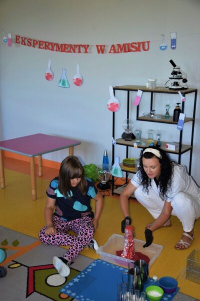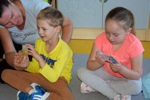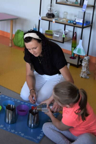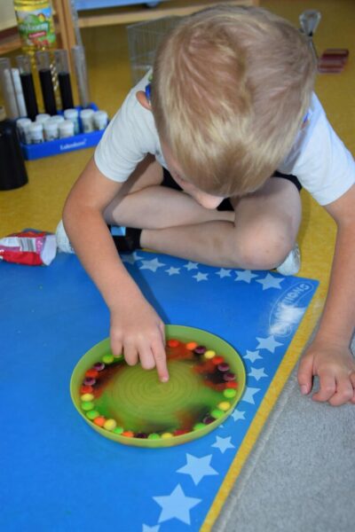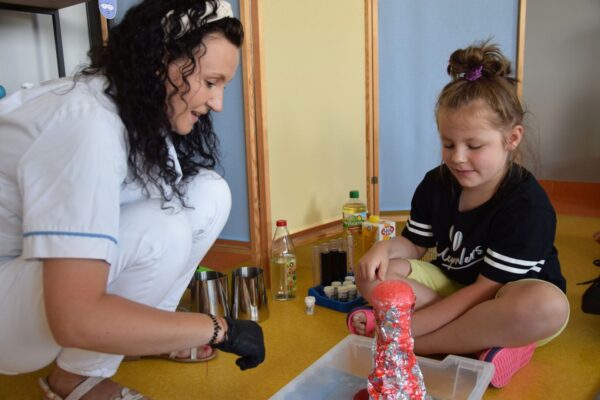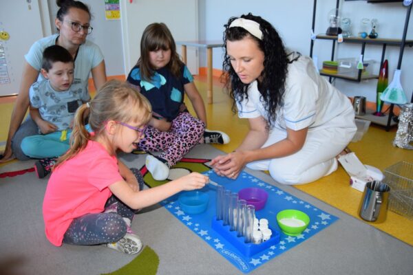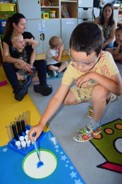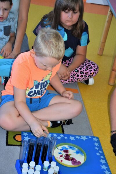 Przedszkolaki w tym tygodniu miały okazję zobaczyć proste, lecz bardzo ciekawe eksperymenty. Na początku dzieci zapoznały się z przyrządami używanymi przez laborantkę między innymi: probówki, pipety, mikroskop itp., a następnie nazywały produkty, które były niezbędne do wykonania kolorowych doświadczeń. Przedszkolaki bardzo starannie pomagały Pani laborantce przy przygotowaniu wulkanu, skittlesowej tęczy na talerzu oraz uciekających barwników i pieprzu po dodaniu oleju. Wszyscy z zaciekawieniem obserwowali pokazywane zjawiska, używając przy tym wszystkich zmysłów.