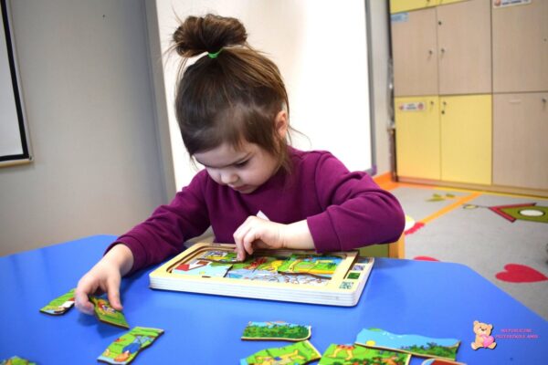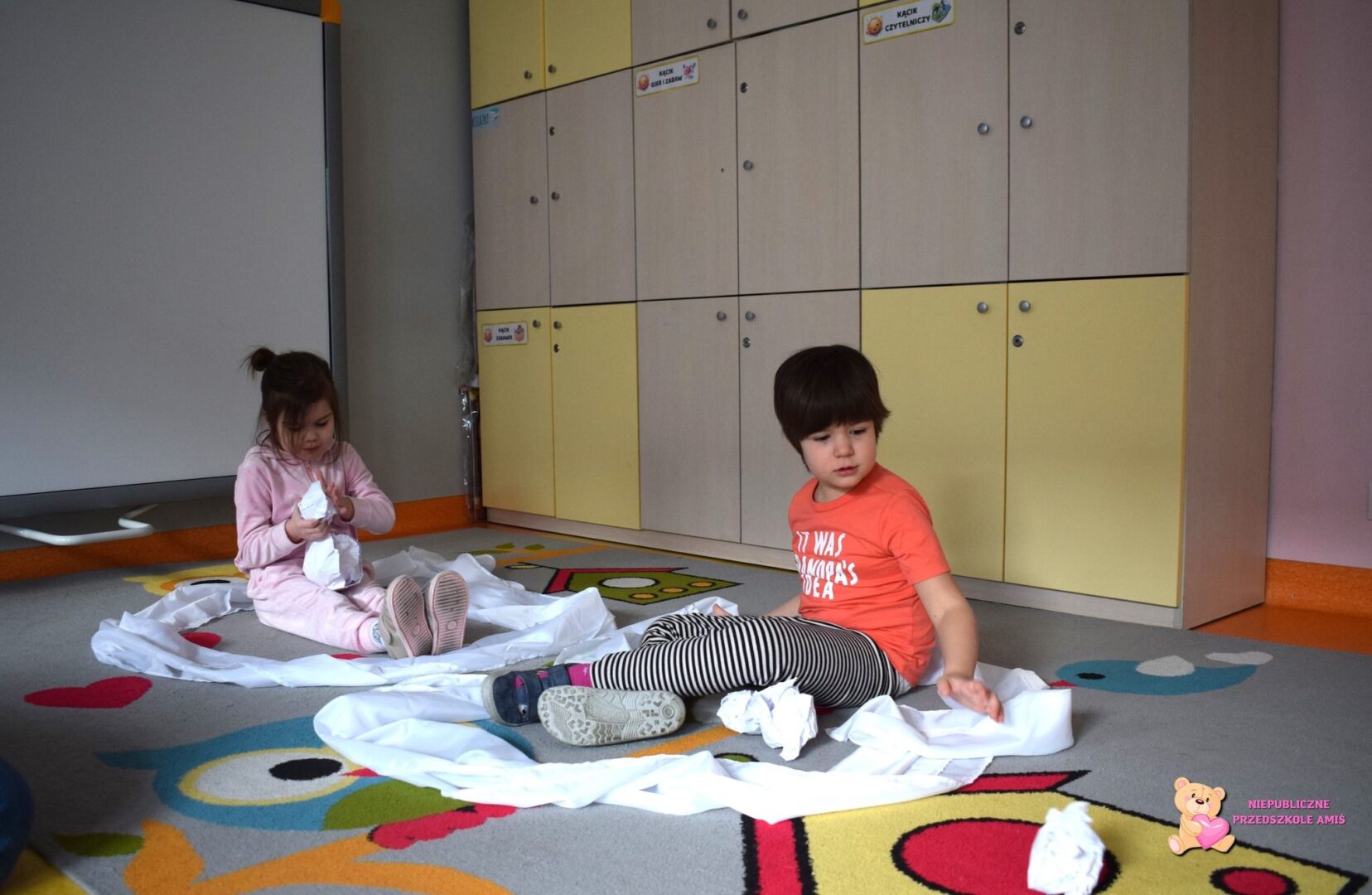 Amisiaki z grupy Promyczków zapoznały się z porą roku zima. Układaliśmy układanki płaskie związane z wszystkimi porami roku, wykonywaliśmy eksperymenty z wykorzystaniem prawdziwego śniegu i farb oraz ćwiczyliśmy rzucanie papierowymi kulami do celu oraz do siebie.