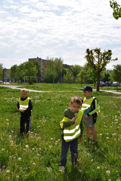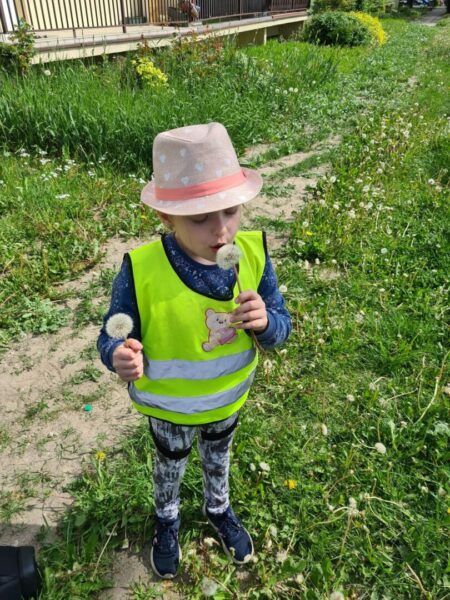 Poszerzali doznania sensoryczne podczas wycieczki na łąkę oraz doskonalili umiejętności obserwacji przyrodniczych poszukując czterolistnej koniczyny. Korzystając ze spaceru odbył się również turniej na najdalej rozdmuchanego dmuchańca.