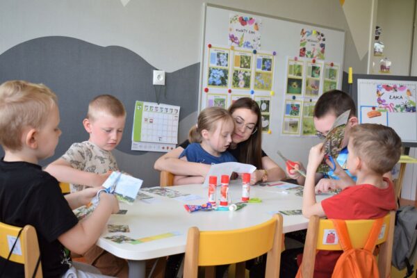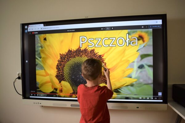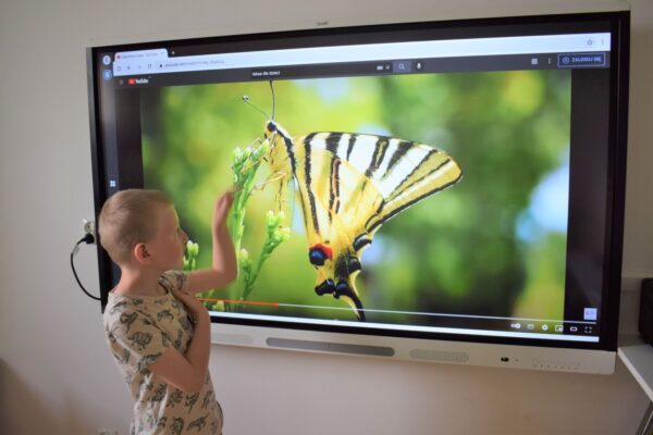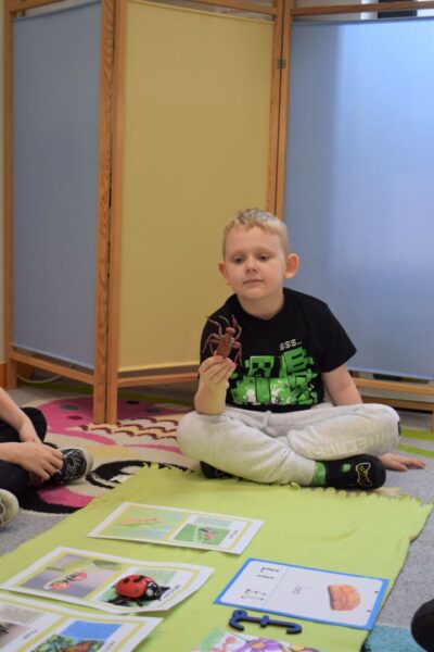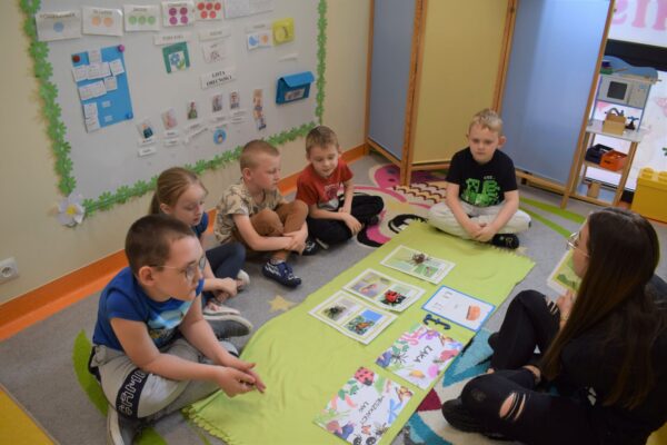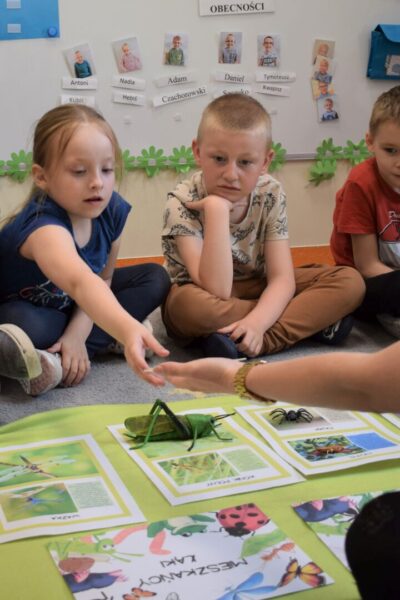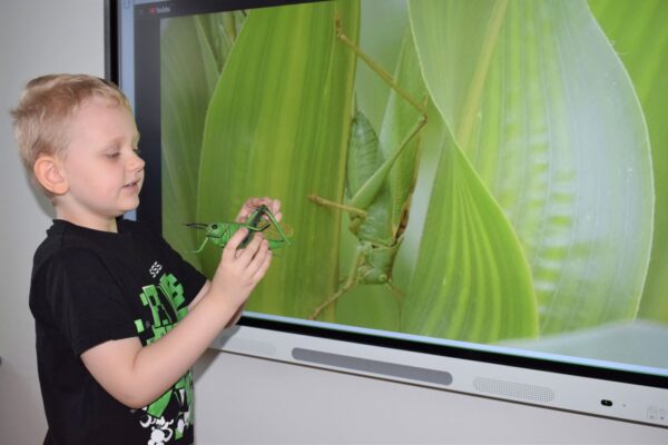 Podczas zajęć edukacyjnych rozwijali koncentrację uwagi i umiejętność udzielania logicznych odpowiedzi przy poznawaniu ekosystemu łąkowego, wiosennych kwiatów oraz mieszkańców łąki . Wykorzystując tablicę multimedialną dzieci miały możliwość wysłuchania odgłosów zwierząt na łące, a następnie je naśladować.