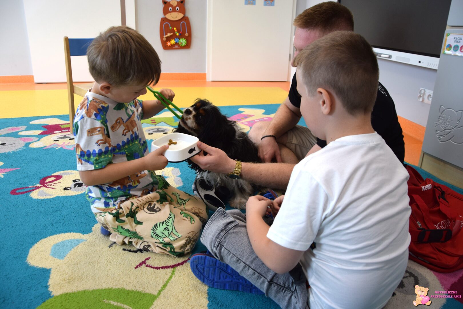 W tym tygodniu grupa „Tygrysków” odkrywała świat emocji i uczuć. Dzieci z ogromnym zaangażowaniem uczyły się rozpoznawać podstawowe emocje – radość😃, smutek😢, złość😡 i strach😮 – przy pomocy kolorowych plansz oraz zabaw z pacynkami 🧸. Przedszkolaki układały nazwy emocji według wzoru i naśladowały różne miny z obrazków 🤪. Nie zabrakło również ciekawych zadań w książeczkach ✏️, które pomogły utrwalić nową wiedzę. Podczas zajęć z dogoterapii 🐶 dzieci dowiedziały się, że zwierzęta potrafią się cieszyć 🥰, ale też smucić czy bać się 😟. „Tygryski” poznały również sposoby na radzenie sobie ze złością 😤, takie jak przytulanie 🤗, ruch i zabawa 🤸‍♀️, a także spokojny oddech 🌬️.