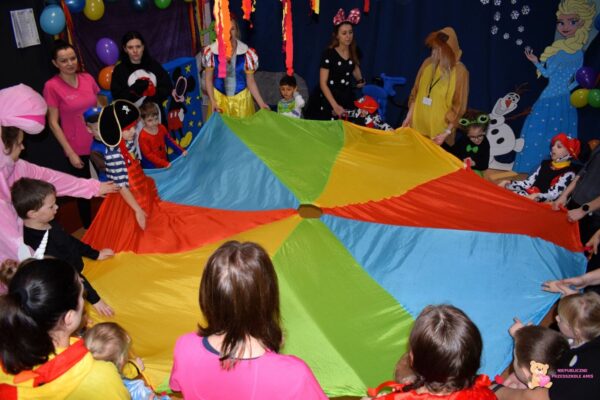 Oprócz wspólnych tańców przy znanych przedszkolnych rytmach były przeróżne zabawy np. z chustą animacyjną, taniec Walentynkowy z sercami