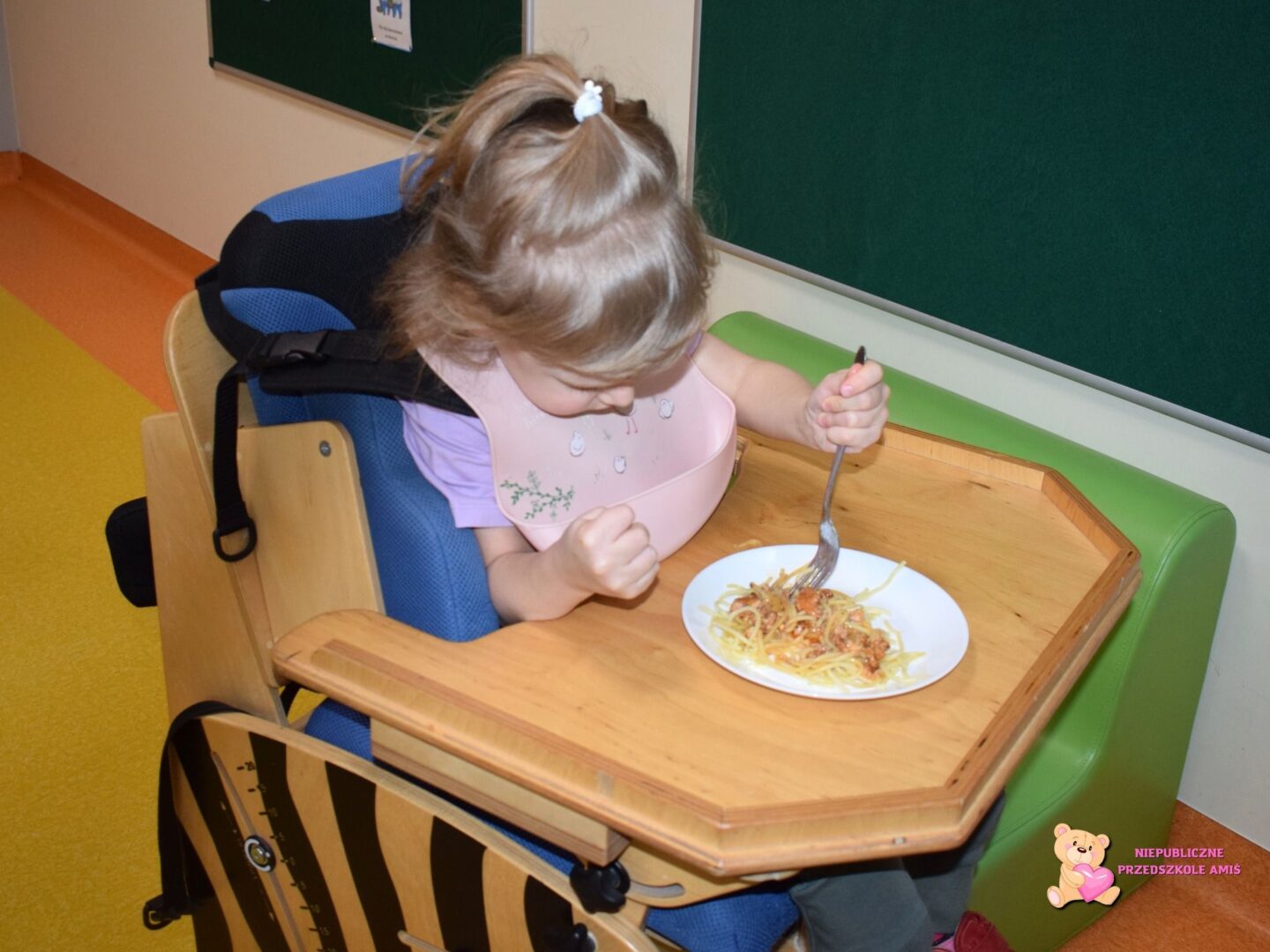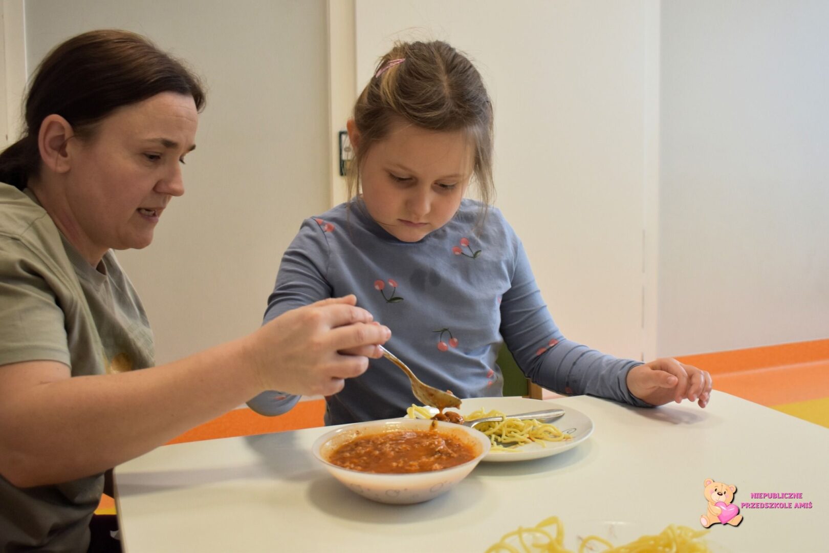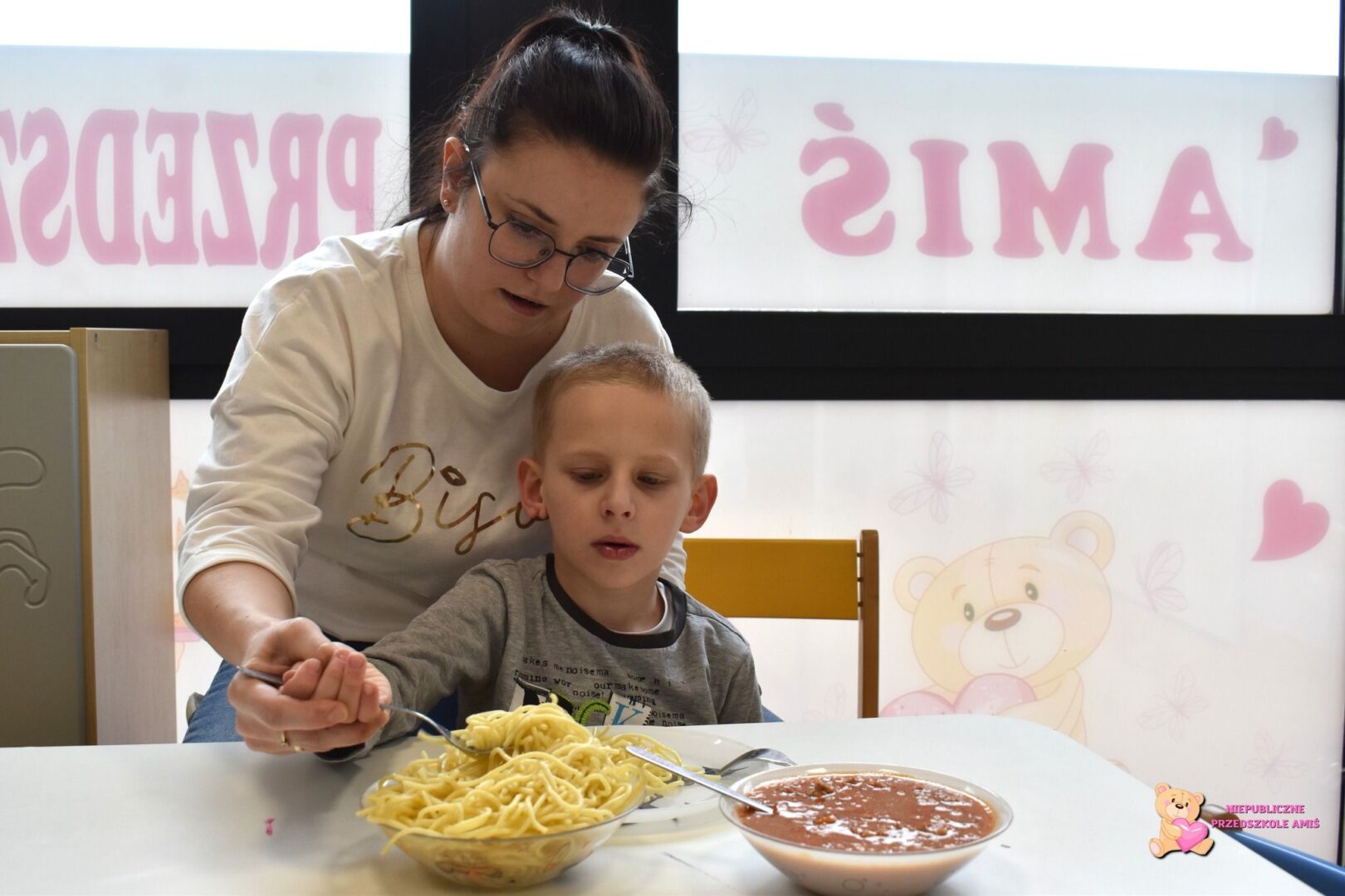 Wczoraj na naszych przedszkolnych stołach zagościła iście włoska potrawa – spaghetti. Sos bolognese to, jeden z najbardziej znanych i lubianych sosów zwłaszcza wśród naszych Amisiów. Dzieci dowiedziały się skąd pochodzi spaghetti i jaka jest historia jego nazwy, po czym ze smakiem spałaszowały pyszne danie. Zresztą zobaczcie sami.