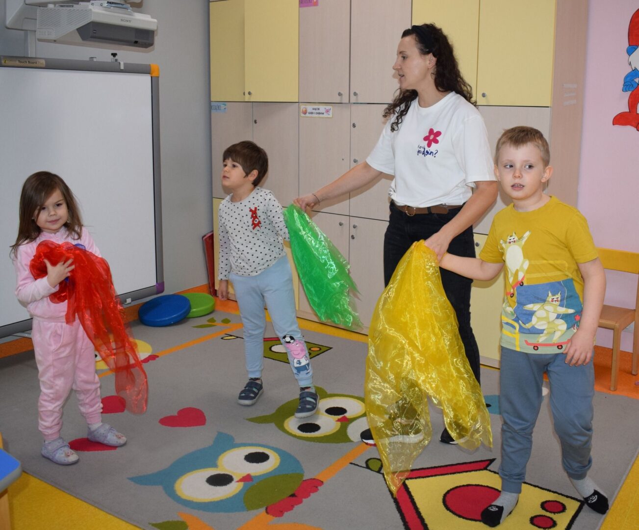 W ubiegłym tygodniu przedszkolaki z grupy Promyczków podczas zajęć dydaktycznych ćwiczyły motorykę małą wyklejając plasteliną czerwone jabłko. Dzieci rozwijały sprawność manualną i zainteresowanie przyrodą podczas której wykonały prace plastyczną w postaci wydzieranki. Ćwiczyły również położenie przedmiotów w przestrzeni: nad, pod, obok, przed. Nie zabrakło również zabaw muzyczno- ruchowych z kolorowymi chustami do piosenki „Kolorowe listki”
