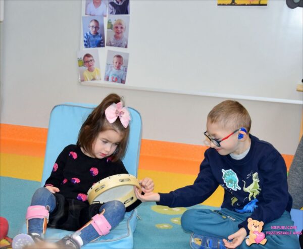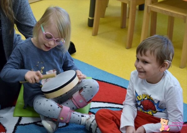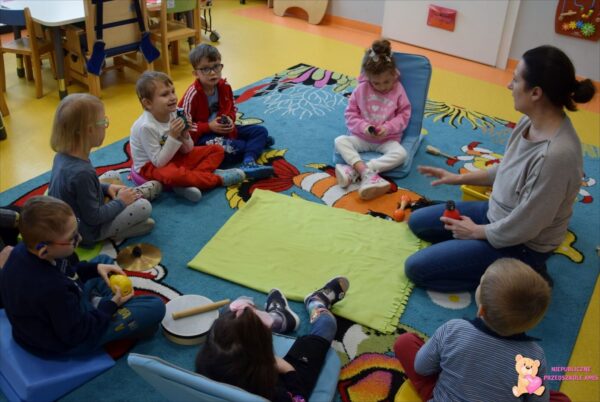 przy spokojnej muzyce wystukując rytm pałeczkami.