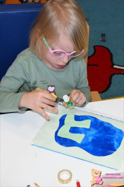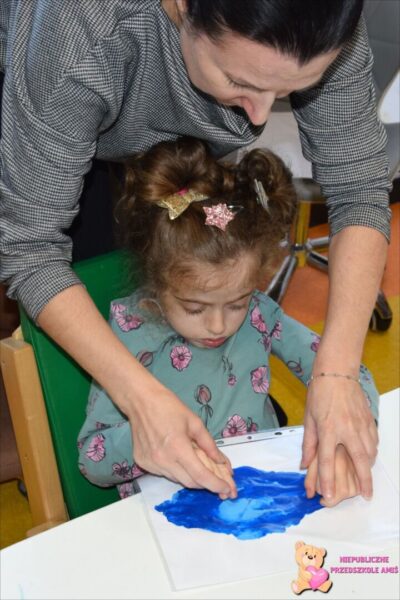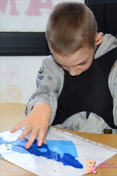 ćwicząc swoje rączki. Kolejną pracą przy której pracowaliśmy farbami była kałuża schowana w folii, mogliśmy ją rozciągać aby powstała jak największa, dolepiliśmy do niej kalosze i wyobrażaliśmy sobie jak w niej skaczemy. Uczestniczyliśmy w zabawie muzycznej. Graliśmy na instrumentach
