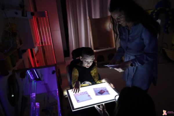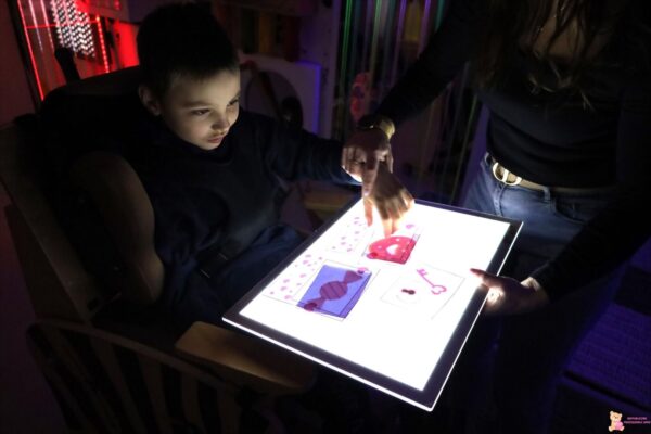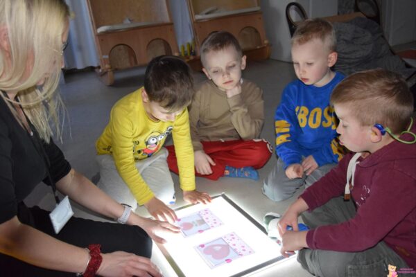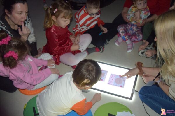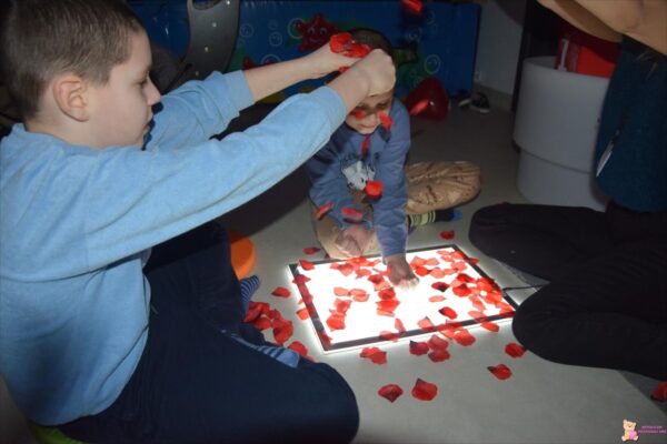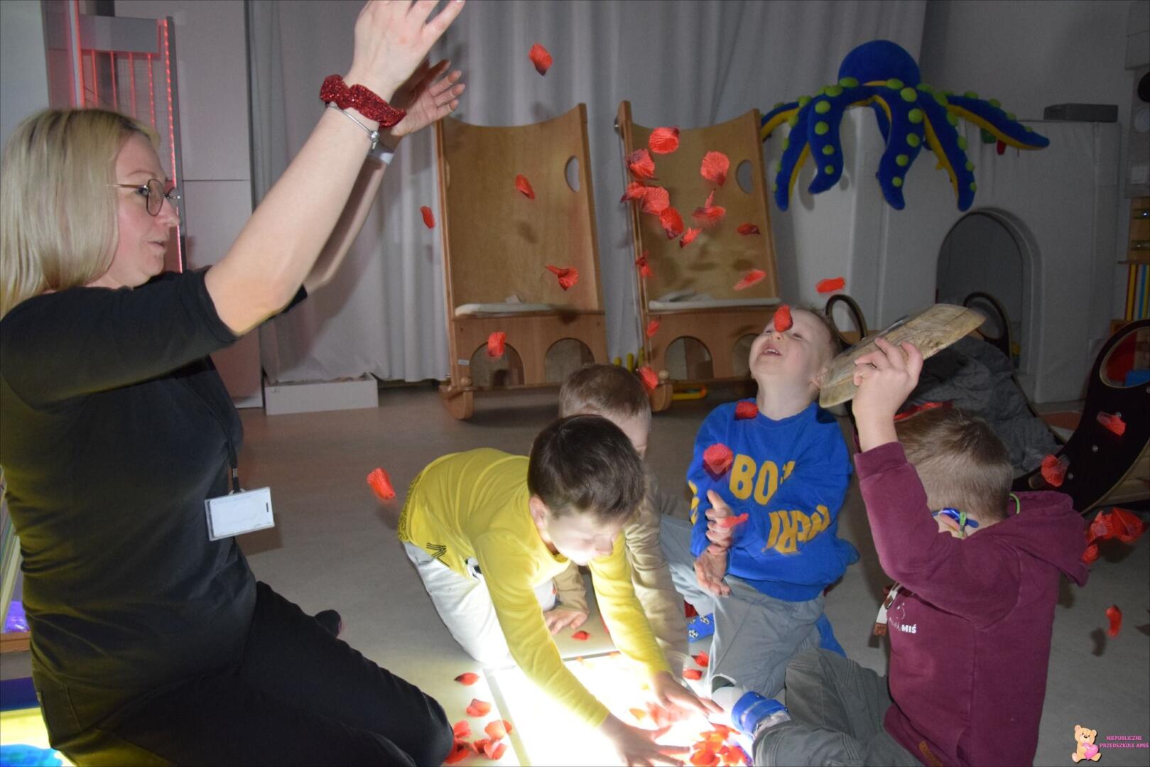 i wesołej muzyki bawiliśmy się sensorycznie. Były zagadki z wykorzystaniem światła , układanki z kwiatowych płatków