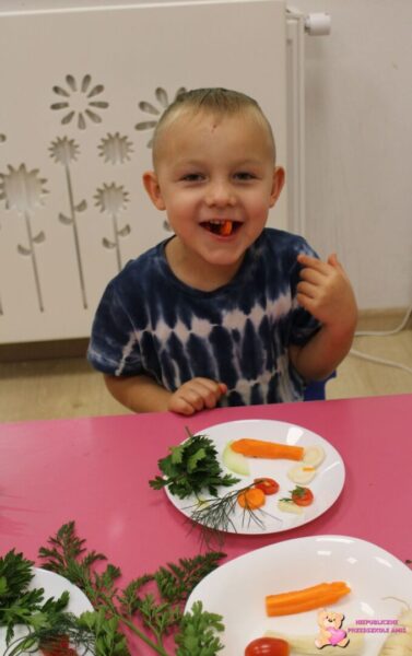 Dzieci podczas zajęć dydaktycznych poznały jesienne warzywa: czosnek, cebulę, ziemniaki, marchew, pietruszkę, liście selera i koper