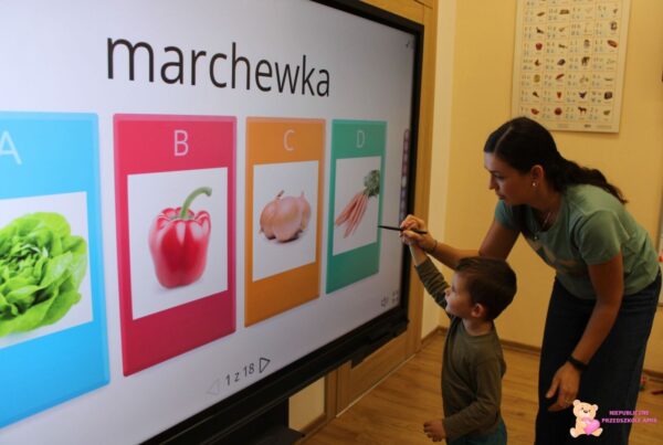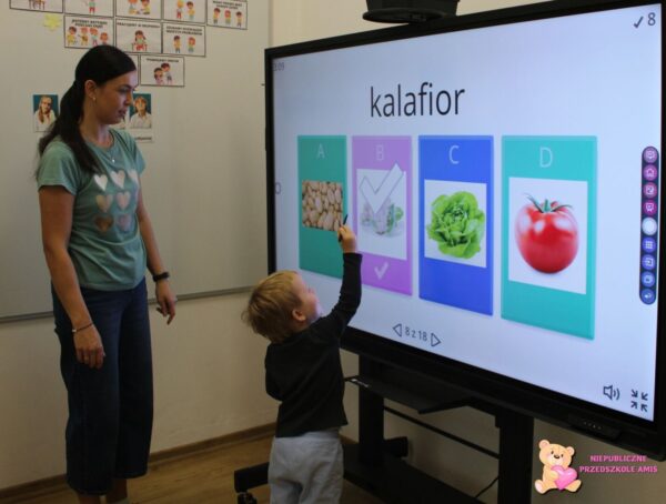 Na zajęciach korzystaliśmy z tablicy multimedialnej. Dzieci obejrzały film edukacyjny o jesieni, a następnie musiały prawidłowo wskazać warzywo.
