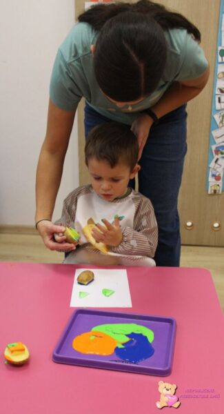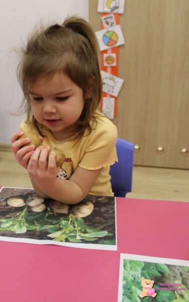 . „Kotki” chętnie wąchały oraz próbowały ich smaku. Wskazywały też dane warzywo na planszy. Poznaliśmy także jak pod ziemią rosną ziemniaki. Później dzieci zrobiły z nich stempelki i ćwiczyły nazywanie kształtów: trójkąt, kwadrat i prostokąt.