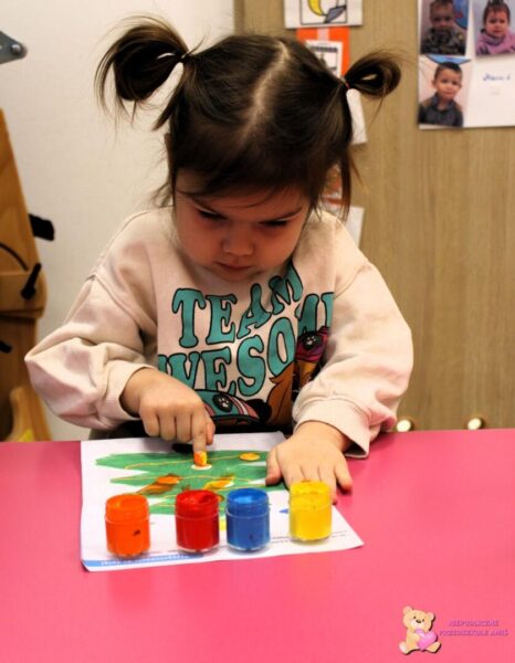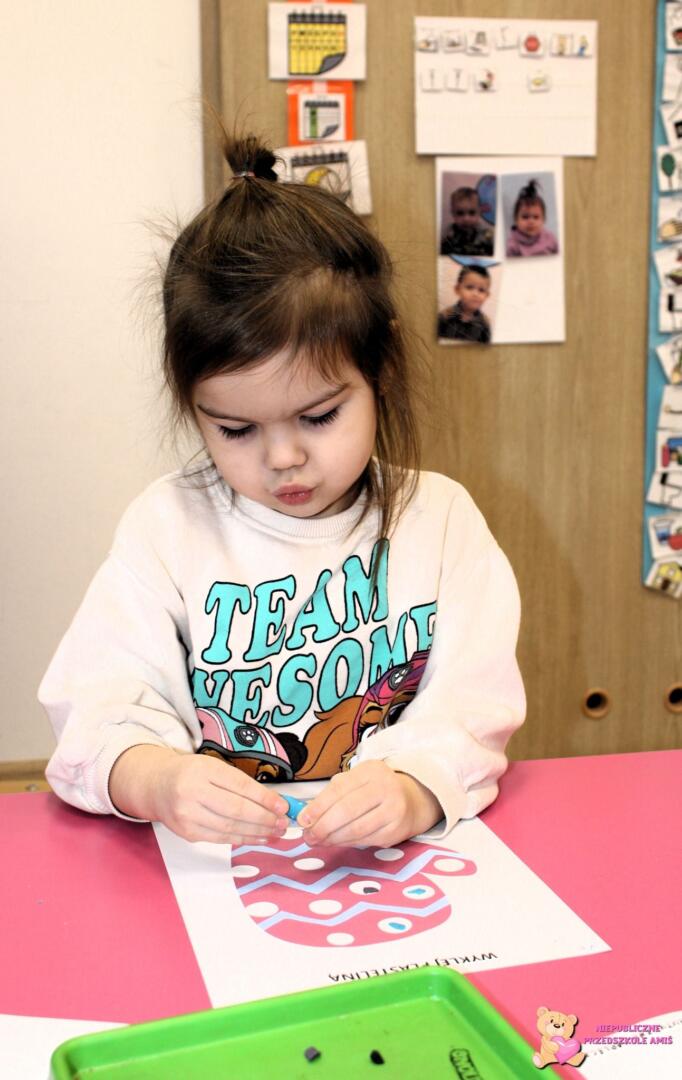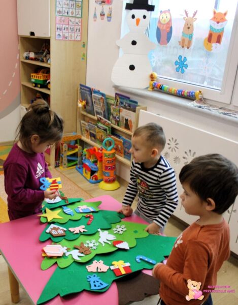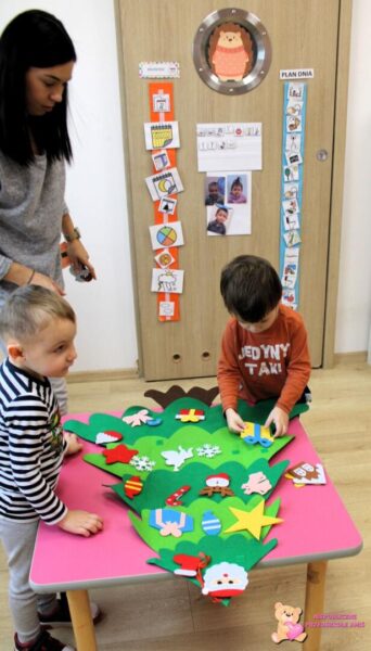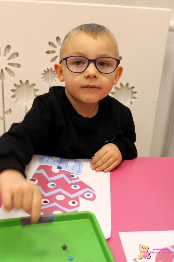 . Dzieci ozdabiały choinkę , formowały kuleczki z bibuły ćwicząc przy tym motorykę małą , a potem naklejały nasze „bombki” na obrazek choinki. Przedszkolaki poznały jakie ozdoby mogą być zawieszone na choinkę i samodzielnie szukały miejsc na drzewku i tam je zamieszczały. Wykonaliśmy też pracę plastyczną , „Rękawiczkę” – dzieci za pomocą plasteliny wyklejały puste pola.