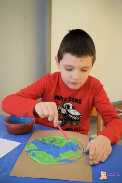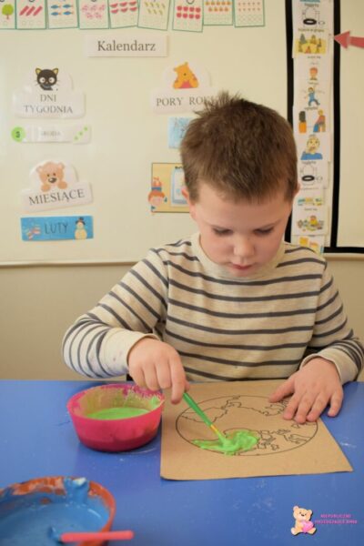 . Chłopcy wykonali także prace plastyczną, w której dodawali odpowiednie składniki, aby uzyskać rosnące farby, a następnie pomalować nimi szablon naszej planety