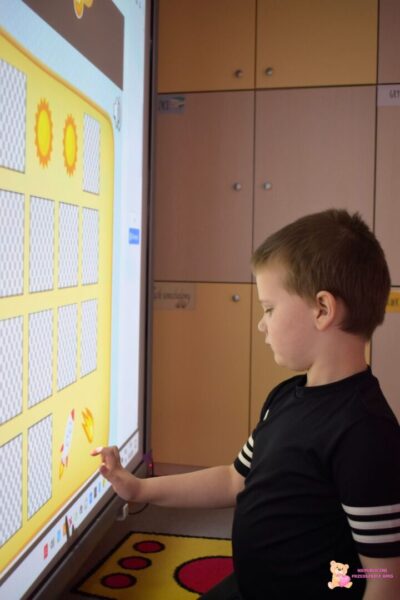 oraz ich kolejność. Na zajęciach Amisiaki nie tylko poszerzały swą wiedzę, ale także doskonaliły analizę i syntezę głoskową, koordynację wzrokowo – ruchową, spostrzegawczość podczas zabaw i ćwiczeń na tablicy multimedialnej
