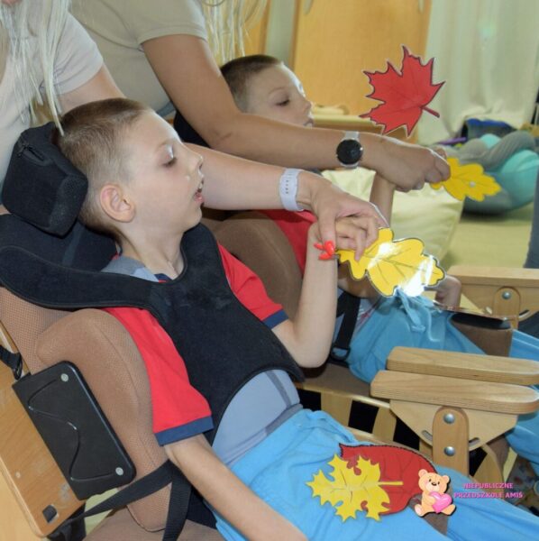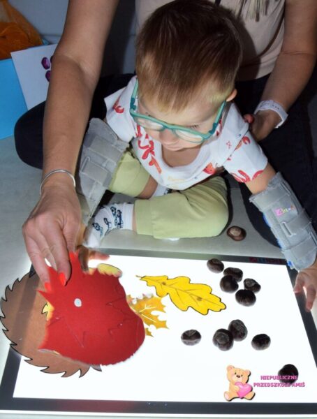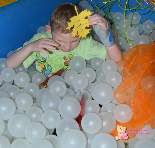 Dotykaliśmy kasztanów i liści, słuchaliśmy ich szelestu i przyklejaliśmy liście na świecącej kolumnie. W basenie z kulkami czekały ukryte skarby- dzieci z radością szukały liści i jeżyka. Na koniec stworzyliśmy jesienną orkiestrę – stukając kasztanami i układaliśmy rytmy, które rozbrzmiewały po całej Sali. Było dużo ruchu i pięknych wrażeń sensorycznych.
