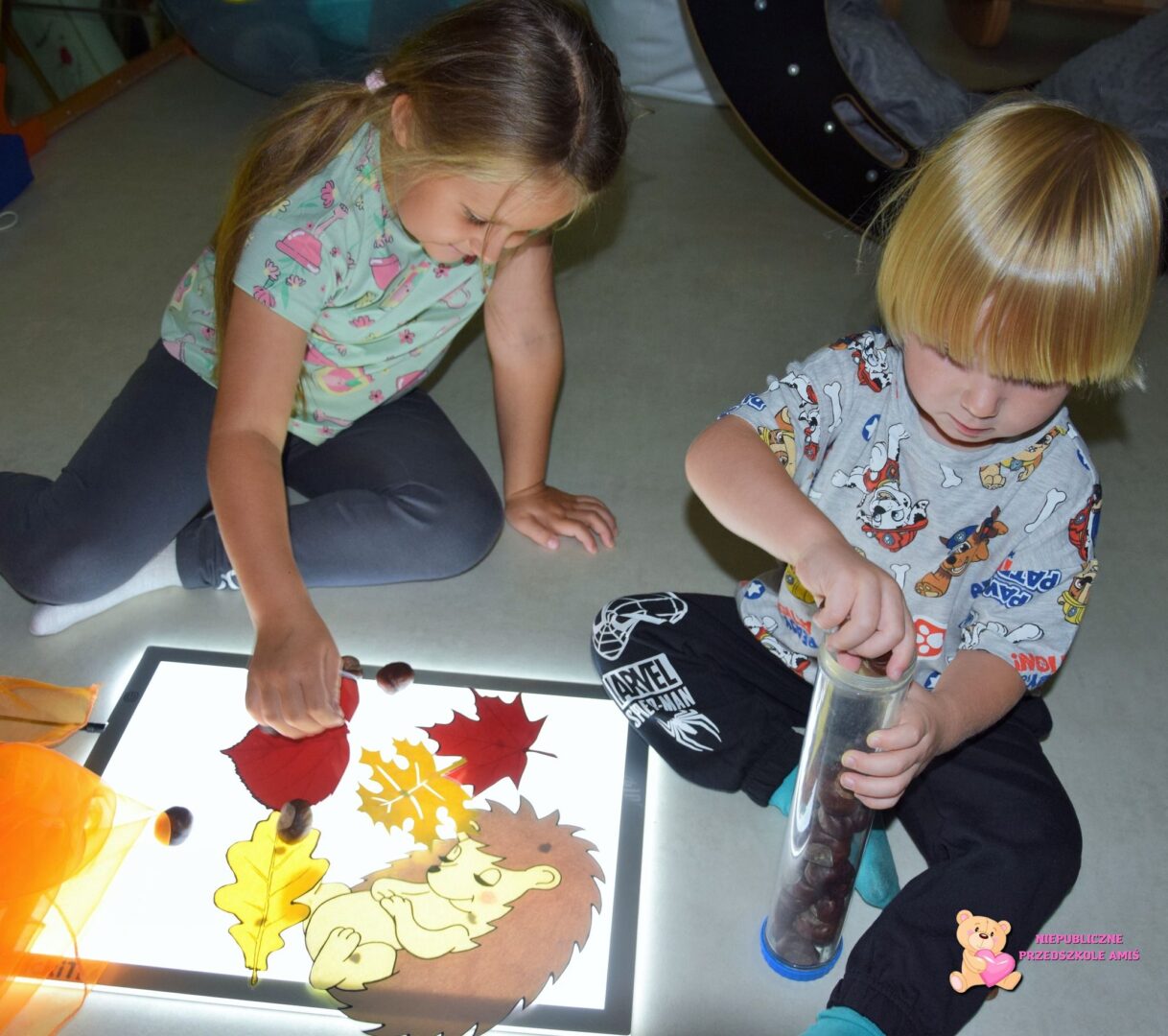 Dotykaliśmy kasztanów i liści, słuchaliśmy ich szelestu i przyklejaliśmy liście na świecącej kolumnie. W basenie z kulkami czekały ukryte skarby- dzieci z radością szukały liści i jeżyka. Na koniec stworzyliśmy jesienną orkiestrę – stukając kasztanami i układaliśmy rytmy, które rozbrzmiewały po całej Sali. Było dużo ruchu i pięknych wrażeń sensorycznych.