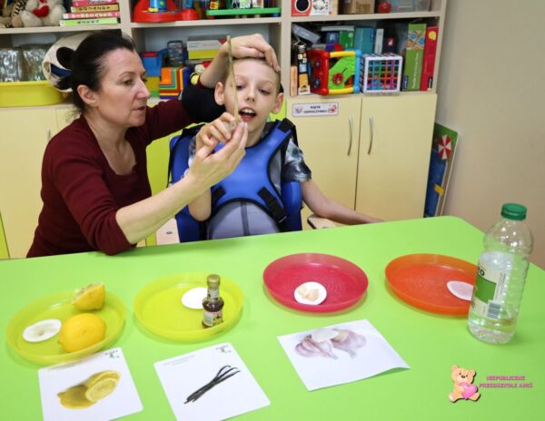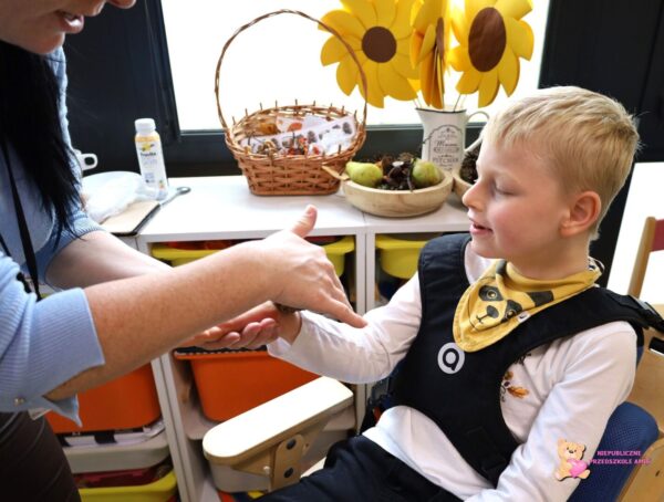 W ubiegłym tygodniu w grupie „Motylki” 🦋dzieci pracowały wszystkimi zmysłami. Poznały smaki i zapachy octu, cytryny🍋, czosnku i wanilii. Odważni spróbowali cytryny, która wcale nie wywołała kwaśnych min u chłopców. Najładniejszym zapachem była oczywiście wanilia, którą ciocie nasmarowały rączki dzieci, robiąc masażyk. Ćwicząc paluszki wylepialiśmy plasteliną jabłuszka🍎. Były też zadania, w których dzieci przeliczały kasztany i dopasowywały liczby do zbiorów. Rozmawialiśmy o zwierzętach i ich przygotowaniach do zimy. Słuchaliśmy dźwięków jakie wydają. Zajęciom towarzyszyła jesienna muzyka i masaże, również stóp. 😁