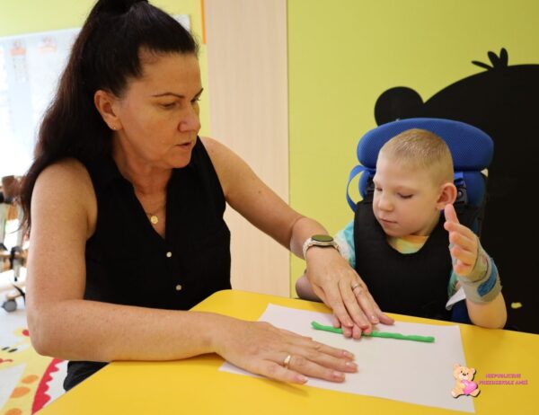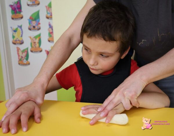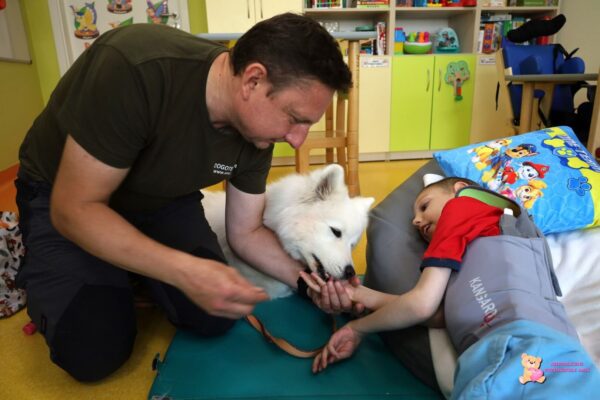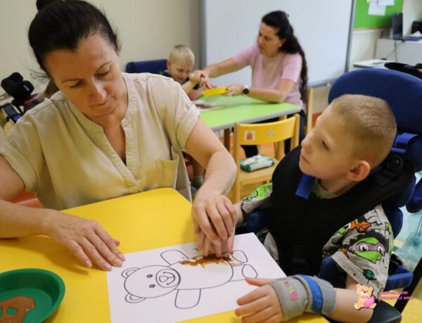 , gdzie mogły w bezpiecznej atmosferze nawiązać bliski kontakt z psem terapeutycznym. Spotkanie to sprzyjało rozładowaniu napięcia i umożliwiło dzieciom wyrażenie swoich emocji. Po sesji z psem, dzieci przystąpiły do twórczej aktywności, rysując misia rączkami ![]()