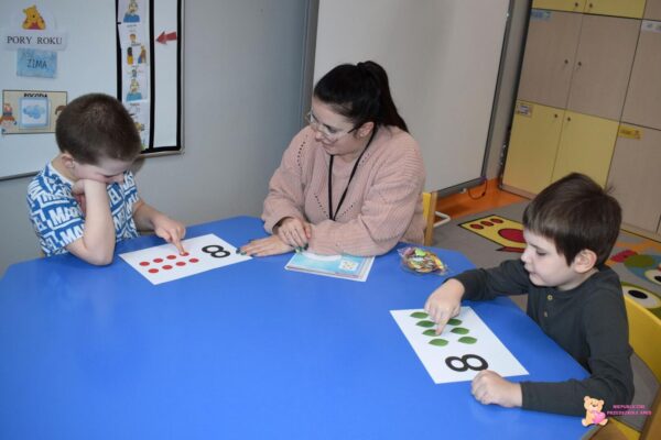 . Utrwalając cyfrę 8, przedszkolaki wyklejały ją kolorowymi kółkami
