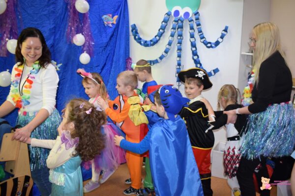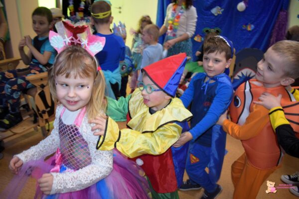 Pomysłowość dzieci i rodziców w doborze kostiumów była ogromna. Na balu pojawiły się dzieci przebrane za zwierzątka wodne🐠 oraz bohaterów znanych bajek o tematyce wodnej, spotkać było można m.in. syrenki🧜‍♀️, rekina🦈, piratów , rybki Nemo, Króla Mórz- Posejdona, i wiele innych.