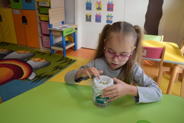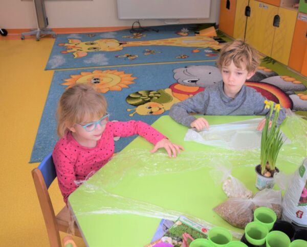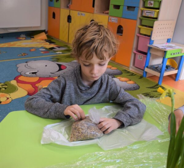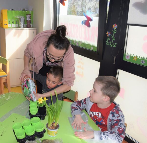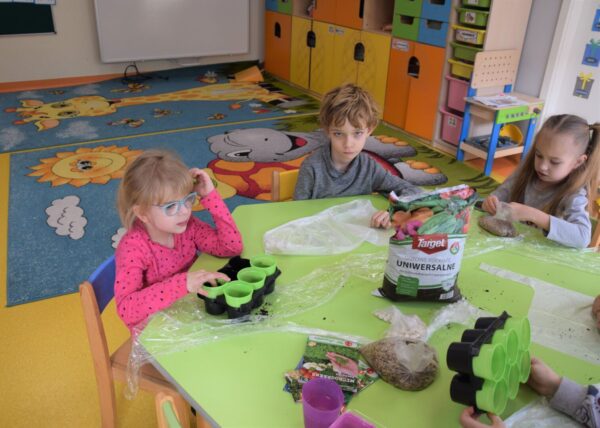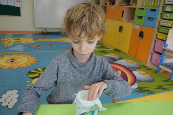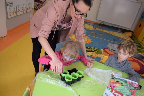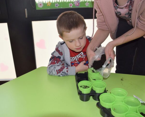 W tym tygodniu dzieci z grupy I i OA rozmawiały z ciociami o potrzebnych rzeczach do założenia hodowli roślin. Dzieci miały do dyspozycji ziemię, małe doniczki, nasiona rzeżuchy, owies, pszenicę, fasolę. Z pomocą cioci nasypaliśmy do doniczek ziemię, wsypaliśmy nasiona rzeżuchy, owsa i je podlaliśmy. Ciocia zwróciła nam uwagę, że będziemy musieli podlewać nasze nasiona, aby wyrosły z nich rzeżucha i owies. Rozmawialiśmy także o tym co jest potrzebne rośliną do tego, aby rosły: woda, światło i odpowiednia temperatura. Następnie przy pomocy słoika, gazy i gumki recepturki założyliśmy hodowlę fasoli. Bardzo nam się podobało to, że mogliśmy na chwilę poczuć się jak ogrodnicy.