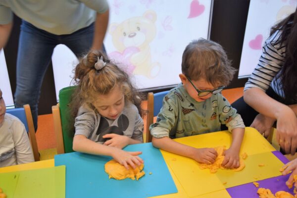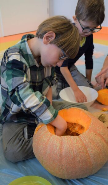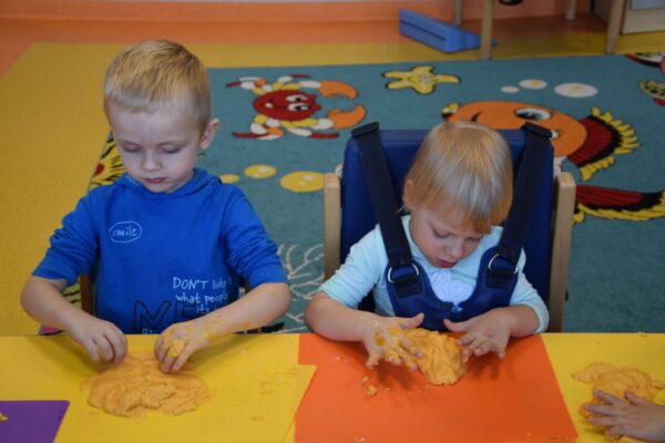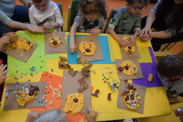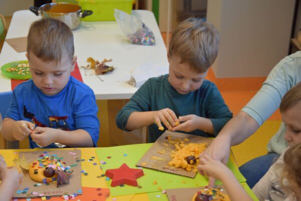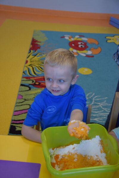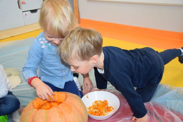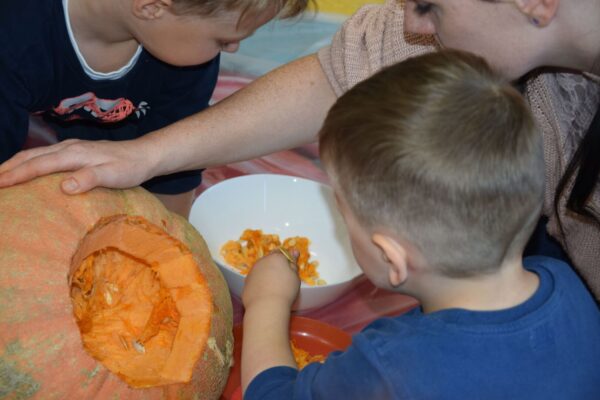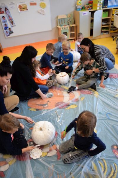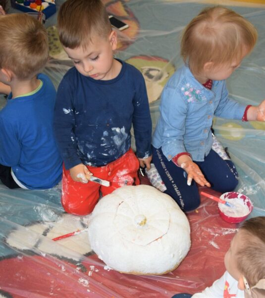 Tematem ubiegłego tygodnia były warzywa, jednak grupa Gwiazdeczek na ostatnich zajęciach najbardziej zainteresowała się dynią. Dzieci miały okazję obejrzeć ją z każdej strony, a nawet mogły zajrzeć do środka i sprawdzić co tam się znajduje. Tam ukazały im się małe ziarenka, które skrupulatnie oddzielały od miąższu, ćwicząc przy tym paluszki. Następnie dzieci sprawdziły swoje umiejętności artystyczne i postanowiły zmienić kolor dyni, które teraz na biało ozdabiają naszą salę. Na koniec dzięki paniom, które wcześniej ugotowały i zblendowały dynie, dzieci mogły utworzyć masę dyniową, a z niej przeróżne dyniowo-jesienne stworki.