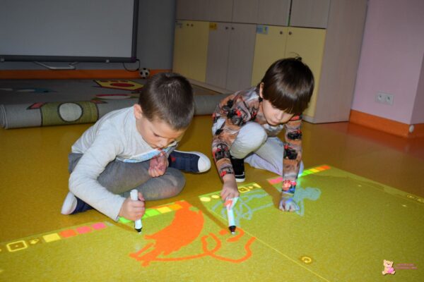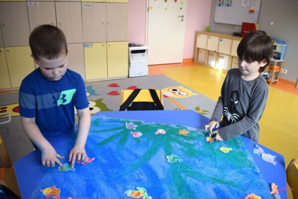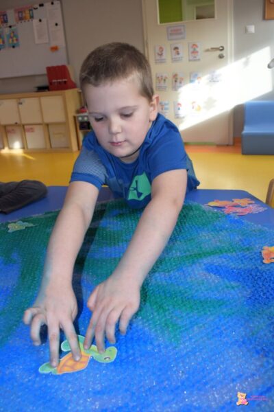 W tym tygodniu grupa „Zajączków” rozwijała swoją wyobraźnie przy pomocy „Magicznego Boxa”. Chłopcy mieli możliwość namalować swój własny rysunek, pisać kolorowe literki oraz powtarzać cyfry. Przy pomocy foli bąbelkowej wykonaliśmy prace plastyczna „Ocean”, malując farbami środowisko wodne oraz doklejając do niej jej mieszkańców.